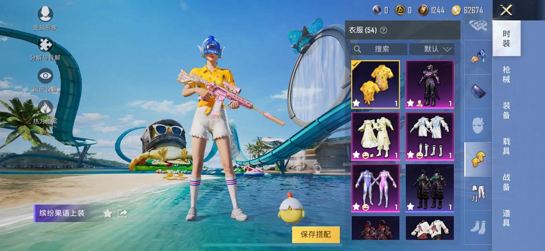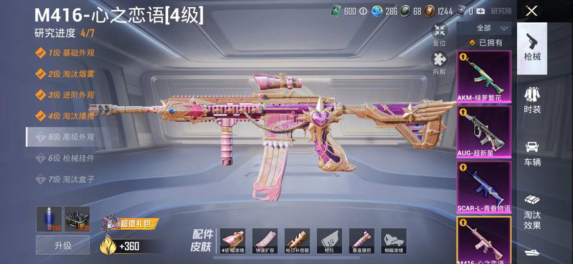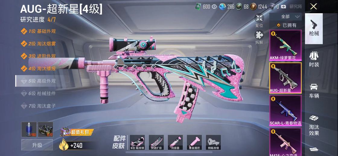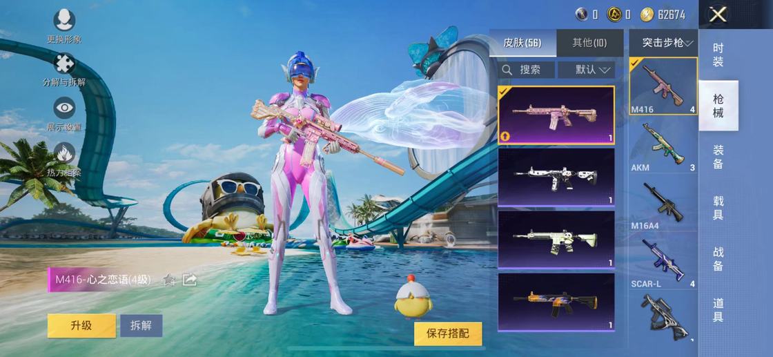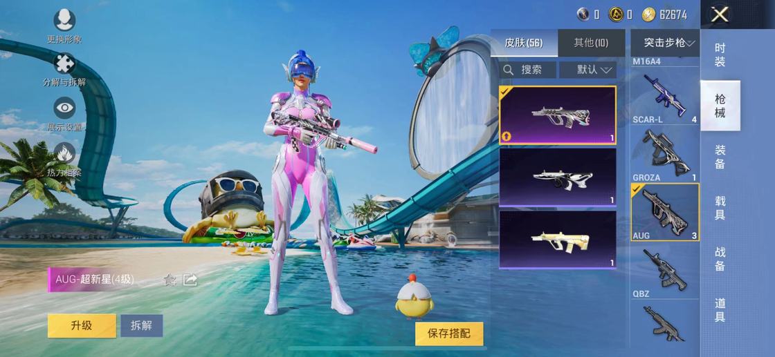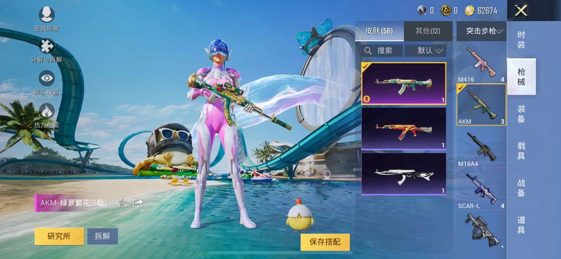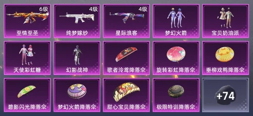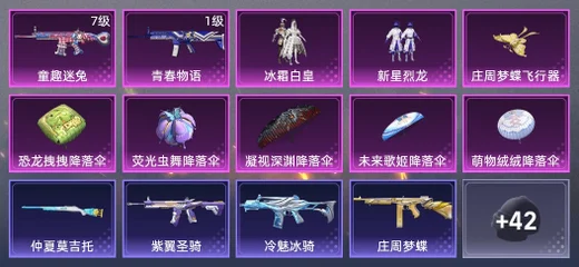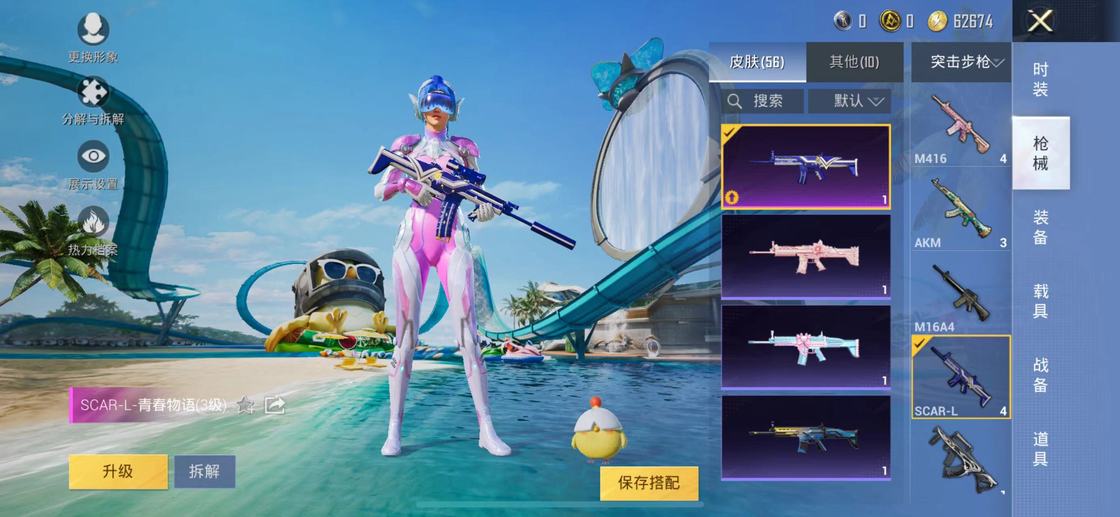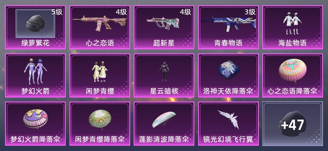 AKM-綠蘿繁花,SCAR-L-青春物語,M416-心之戀語,AUG-超新星,AKM-2P戰鬥服款,SCAR-L-粉錦千層,SCAR-L-是愛神辣,M416-摩登王國,GROZA-2B戰鬥服款,AUG-閒夢青纓,AUG-2P戰鬥服款,Mk47-炫光之旅,G36C-六號樹人,AC-VAL-快閃甜心,Kar98K-2B戰鬥服款,AWM-焰鷹斗篷,M200-驚鴻俠骨,SKS-未來歌姬,Mk14-是愛神辣,M417-驚鴻俠骨,MK20-H-快閃甜心,UMP45-詭娃娃,UMP45-仲夏莫吉托,Vector-焰鷹斗篷,P90-快閃甜心,DBS-粉櫻探戈,DBS-焰鷹斗篷,SPAS-12-田園牧歌,M249-蓮影清波,DP-28-焰鷹斗篷,MG3-驚鴻俠骨,TMP-9-未來歌姬