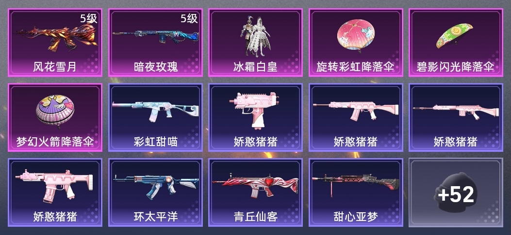 M416-風花雪月,SLR-暗夜玫瑰,AKM-奇異狩獵者,AKM-環太平洋,AKM-萌趣顏糰子,AKM-恐龍拽拽,M16A4-甜心亞夢,SCAR-L-青丘仙客,M416-緋紅前夜,AUG-耀粉歌者,QBZ-飛馳魅影,M762-瑞龍福將,M762-詭娃娃,G36C-時空追擊者,AC-VAL-甜心亞夢,AC-VAL-彩虹甜喵,蜜獾-嬌憨豬豬,Kar98K-飛馳魅影,Win94-瑞龍福將,SKS-時空追擊者,SLR-嬌憨豬豬,UZI-嬌憨豬豬,UMP45-時空追擊者,MP5K-怪笑瘋兔,P90-飛馳魅影,S1897-飛馳魅影,S12K-嬌憨豬豬,S12K-瑞龍福將,DBS-時空追擊者,DBS-甜心亞夢,DP-28-甜心亞夢,MG3-瑞龍福將