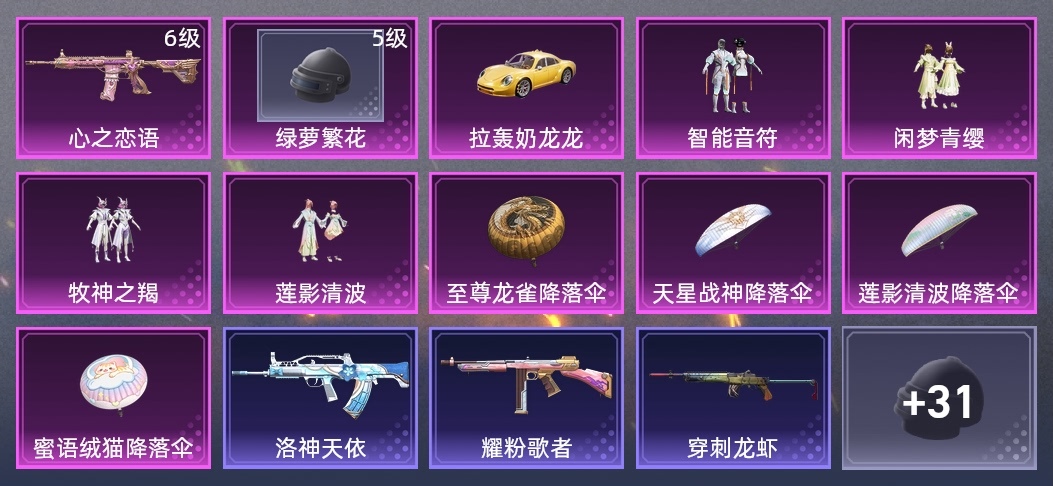 AKM-綠蘿繁花,M416-心之戀語,SCAR-L-甜蜜旋律,M416-摩登王國,GROZA-懵萌河馬,AUG-閒夢青纓,QBZ-未來歌姬,QBZ-洛神天依,G36C-懵萌河馬,AC-VAL-快閃甜心,莫辛納甘-懵萌河馬,AMR-鏡光幻境,M200-驚鴻俠骨,SKS-未來歌姬,SKS-迅猛狂鯊,Mini14-穿刺龍蝦,M417-驚鴻俠骨,MK20-H-快閃甜心,湯姆遜-耀粉歌者,P90-快閃甜心,M249-蓮影清波,MG3-驚鴻俠骨,PKM-懵萌河馬