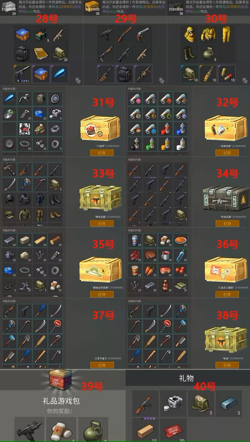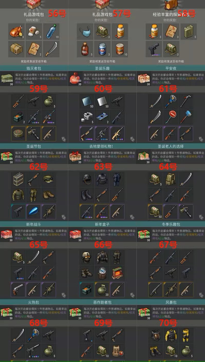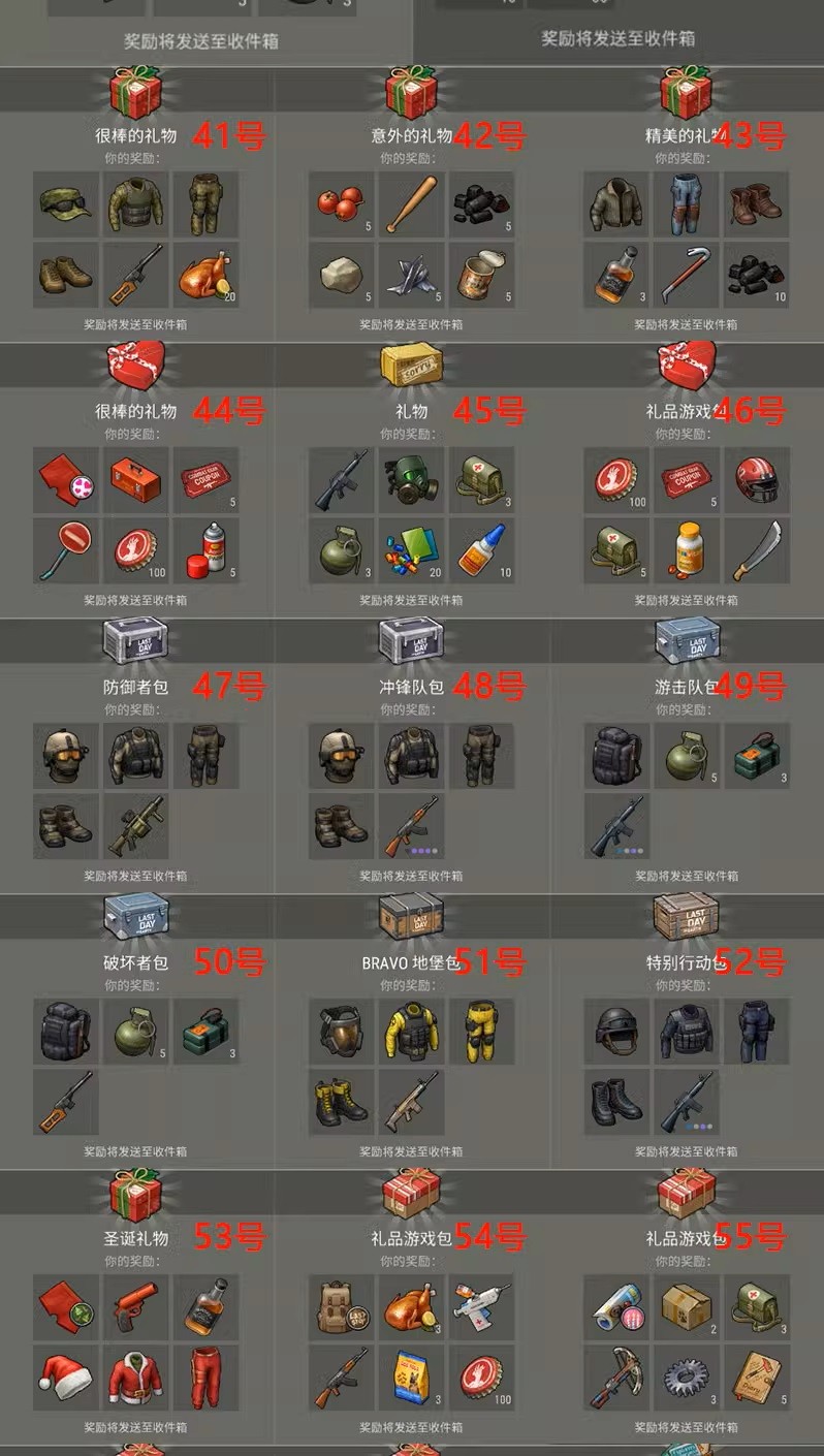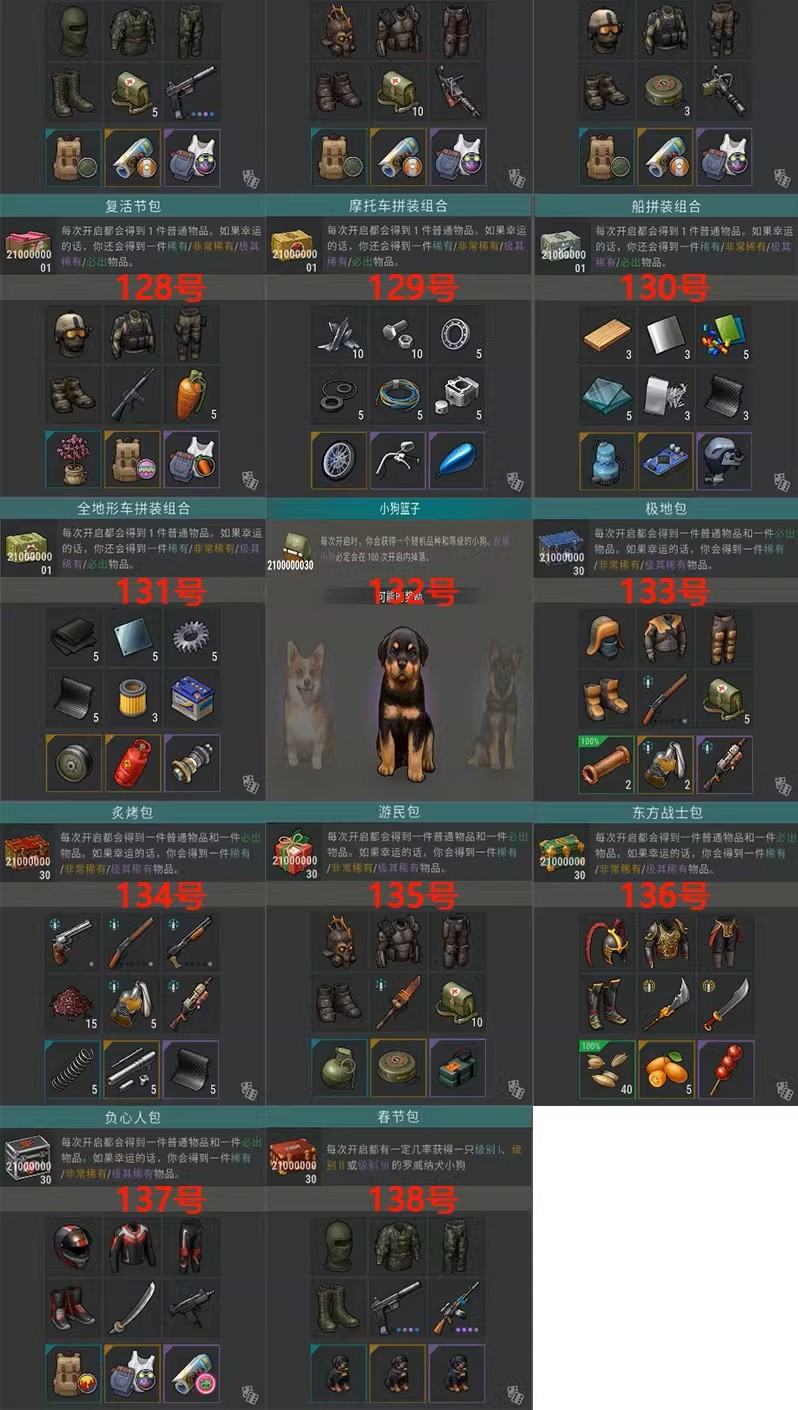 藍色鑰匙+無限紅色鑰匙送:無限4級牧羊犬+無限4級哈士奇+無限4級柯基+無限4級羅威納犬+無限於糧+無限狗糧+成品摩托車+成品地形車+成品摩托艇+無限汽油+小狗秒長大+走路秒到+20個頂級自動砲台+10個75個保險箱+全部背包皮膚+全部內衣皮膚+全部套裝皮膚+全部摩托車皮膚+無限耐久射釘槍
