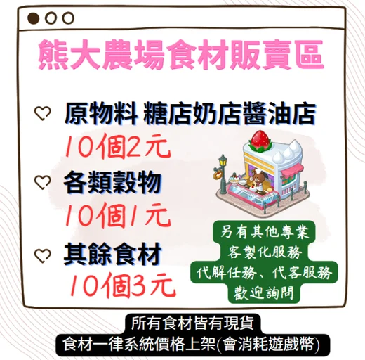 補貨活動商品食材10個3元穀物10個1元會消耗遊戲幣,上架皆為系統預設價格,不另外修改金額。