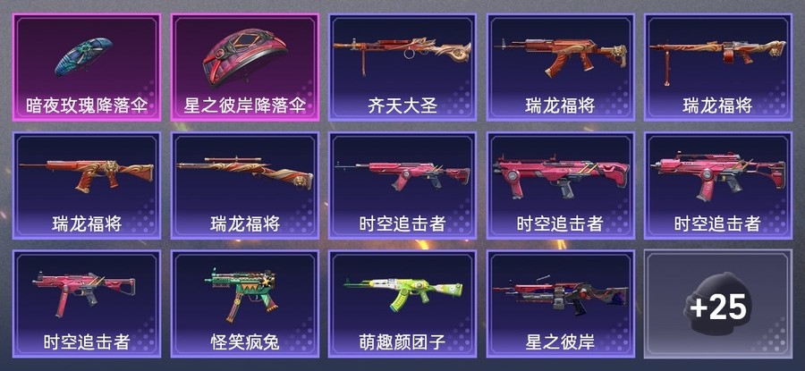 AKM-萌趣顏糰子,M416-神秘黑貓,AUG-青春冒險家,M762-瑞龍福將,Mk47-青春冒險家,G36C-時空追擊者,Kar98K-2B戰鬥服款,Win94-瑞龍福將,SKS-時空追擊者,QBU-青春冒險家,UMP45-時空追擊者,湯姆遜-耀粉歌者,野牛-青春冒險家,MP5K-怪笑瘋兔,S12K-瑞龍福將,DBS-時空追擊者,M249-星之彼岸,DP-28-齊天大聖,MG3-瑞龍福將
