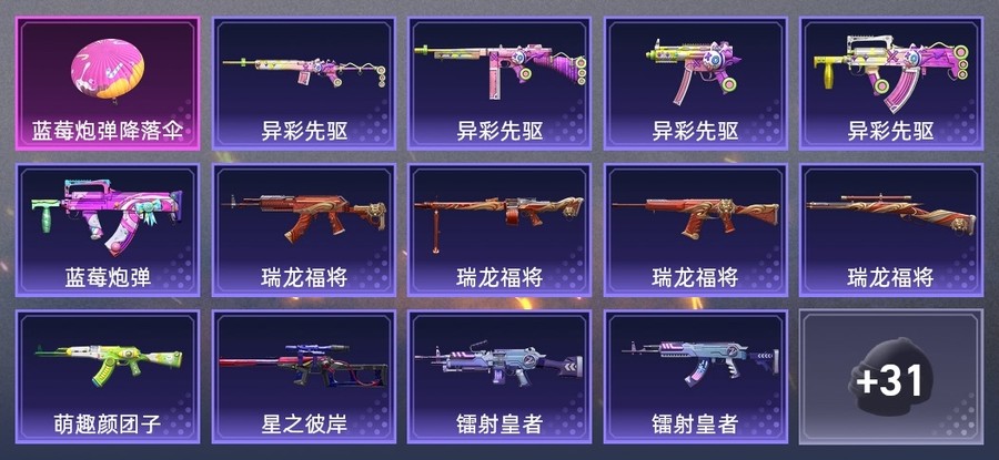AKM-萌趣顏糰子,AKM-春暖花開,GROZA-藍莓炮彈,GROZA-異彩先驅,AUG-耀粉歌者,QBZ-原初聖火,M762-瑞龍福將,M762-鐳射皇者,M24-奇異狩獵者,Win94-瑞龍福將,VSS-鐳射皇者,VSS-星之彼岸,Mini14-異彩先驅,Mini14-原初聖火,UMP45-詭娃娃,湯姆遜-奇異狩獵者,湯姆遜-異彩先驅,MP5K-異彩先驅,S1897-鐳射皇者,S12K-瑞龍福將,M249-鐳射皇者,DP-28-原初聖火,MG3-瑞龍福將