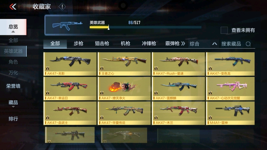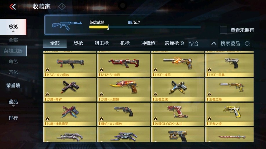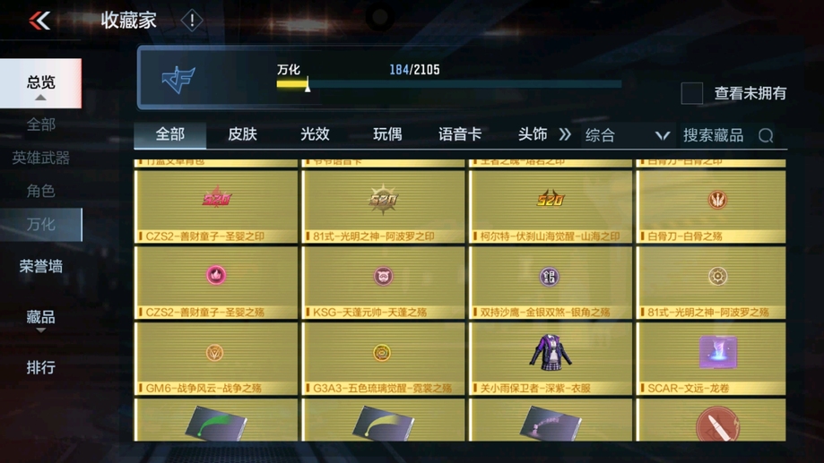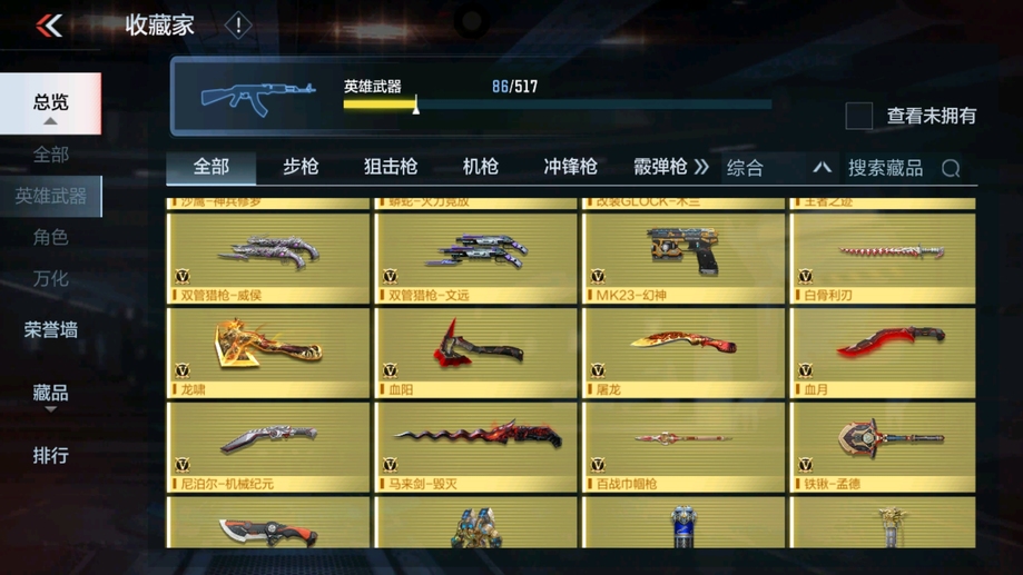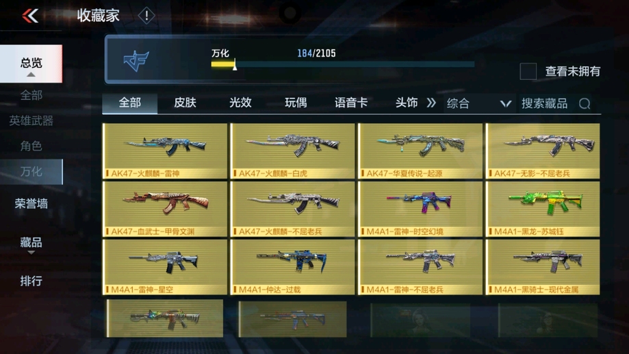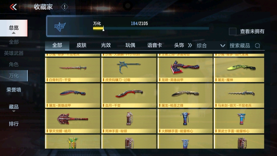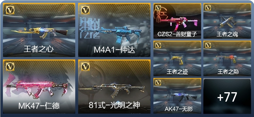 MK47-仁德,M4A1-仲達,81式-光明之神,CZS2-善財童子,雙管獵槍-威侯,雙管獵槍-文遠,MK23-幻神,鐵鍬-孟德,白骨利刃,AK47-無影,M4A1-雷神,AK47-燎天淨火,AK47-木蘭,AK47-變色龍,M4A1-死神,M4A1-黑騎士,QBZ03-金色薔薇,AUG-機械紀元,AK47-華夏傳說,AK47-雷麒麟,AK47-心動次元覺醒,AK47-Rush-星速,AK47-血武士,AK47-幸運日,M4A1-心動次元覺醒,M4A1-運輸船,M4A1-千變,M4A1-龍血,SCAR-探星者,巴雷特-金色薔薇,巴雷特-極光,巴雷特-毀滅,98K-黑騎士,AWM-天使,巴雷特-冬滅覺醒,09式狙-天神,AWM-裁決,RPK-盤龍,加特林-蟒蛇,MK5-極光,CZS2-心動次元覺醒,湯姆遜-烈龍,地獄火,地獄烈炎,毀滅征服者-超越Max,KSG-火力競放,改裝GLOCK-木蘭,沙鷹-修羅,沙鷹-火麒麟,USP-雷暴,USP-神罰,蟒蛇-火力競放,尼泊爾-機械紀元,馬來劍-毀滅,百戰巾幗槍,叢林匕首-火力競放,迷你究極泰坦,龍嘯,血月,血陽,屠龍,黑騎士煙霧彈,燃燒彈-遊騎兵,手雷-蘆裡乾坤,死神煙霧彈