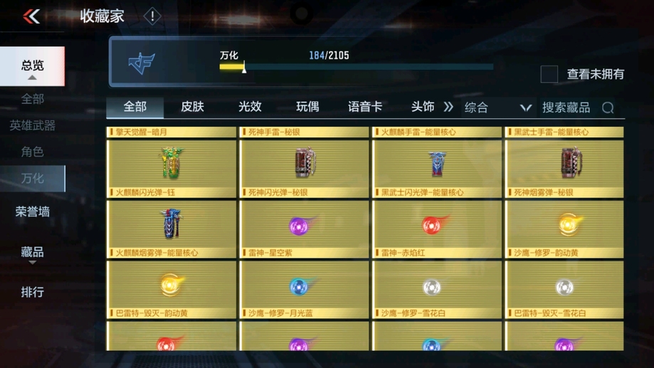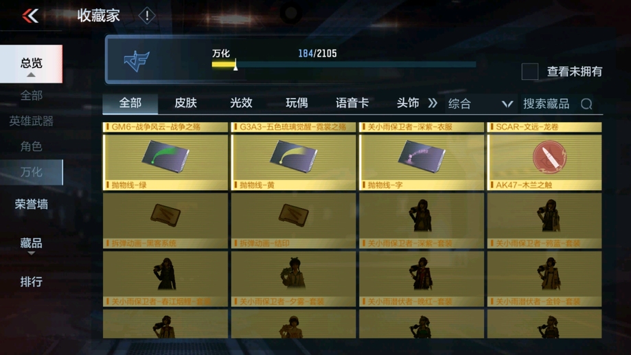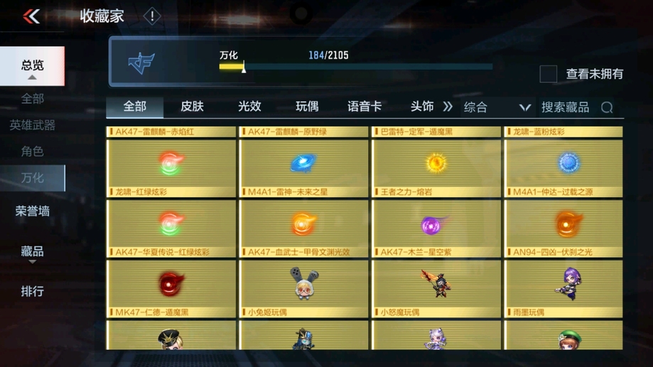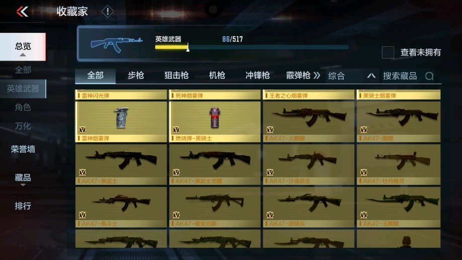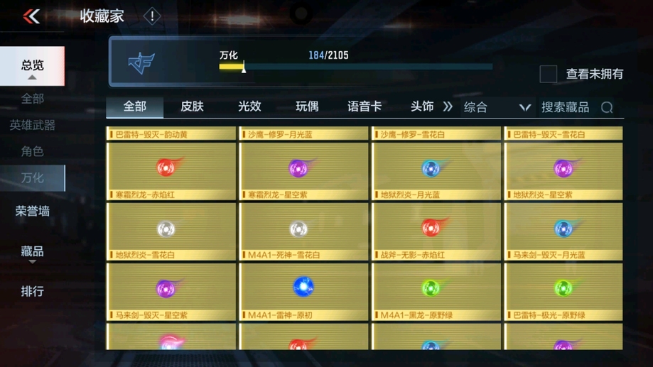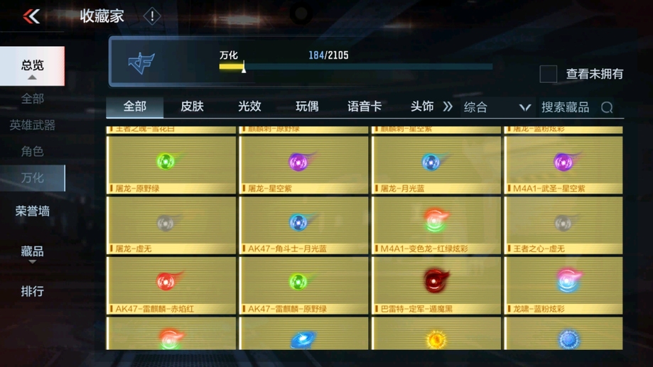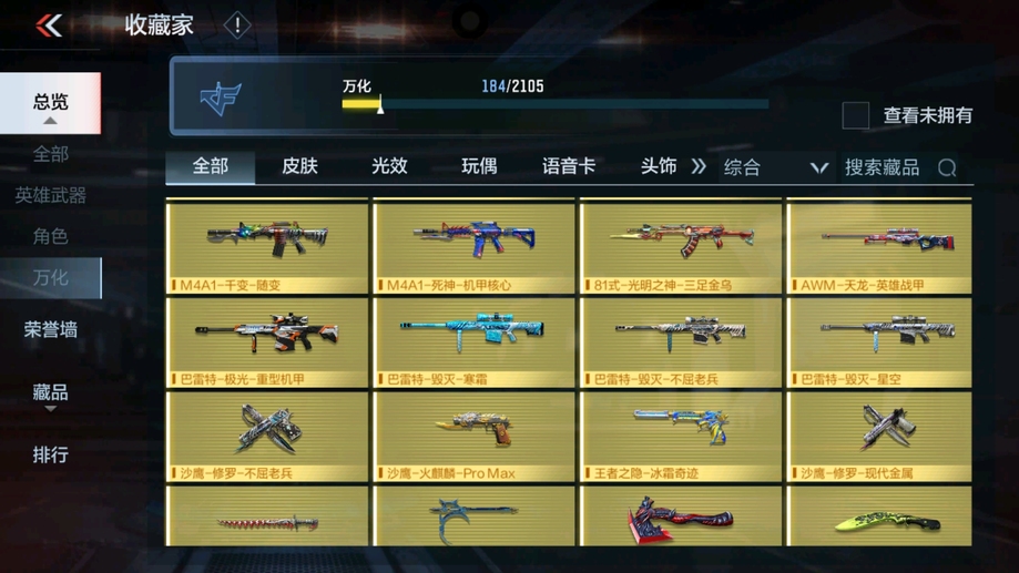 MK47-仁德,M4A1-仲達,81式-光明之神,CZS2-善財童子,雙管獵槍-威侯,雙管獵槍-文遠,MK23-幻神,鐵鍬-孟德,白骨利刃,AK47-無影,M4A1-雷神,AK47-燎天淨火,AK47-木蘭,AK47-變色龍,M4A1-死神,M4A1-黑騎士,QBZ03-金色薔薇,AUG-機械紀元,AK47-華夏傳說,AK47-雷麒麟,AK47-心動次元覺醒,AK47-Rush-星速,AK47-血武士,AK47-幸運日,M4A1-心動次元覺醒,M4A1-運輸船,M4A1-千變,M4A1-龍血,SCAR-探星者,巴雷特-金色薔薇,巴雷特-極光,巴雷特-毀滅,98K-黑騎士,AWM-天使,巴雷特-冬滅覺醒,09式狙-天神,AWM-裁決,RPK-盤龍,加特林-蟒蛇,MK5-極光,CZS2-心動次元覺醒,湯姆遜-烈龍,地獄火,地獄烈炎,毀滅征服者-超越Max,KSG-火力競放,改裝GLOCK-木蘭,沙鷹-修羅,沙鷹-火麒麟,USP-雷暴,USP-神罰,蟒蛇-火力競放,尼泊爾-機械紀元,馬來劍-毀滅,百戰巾幗槍,叢林匕首-火力競放,迷你究極泰坦,龍嘯,血月,血陽,屠龍,黑騎士煙霧彈,燃燒彈-遊騎兵,手雷-蘆裡乾坤,死神煙霧彈