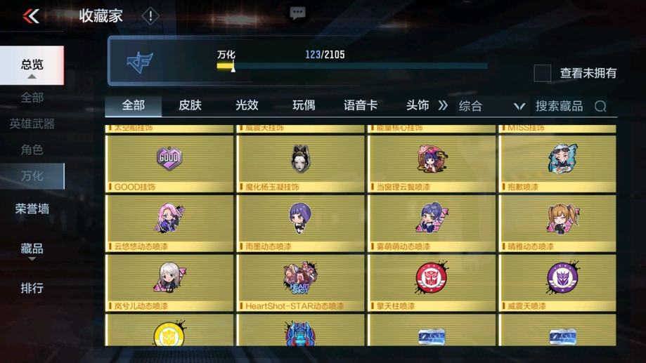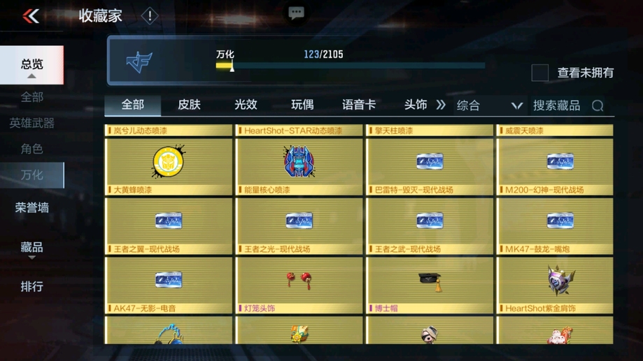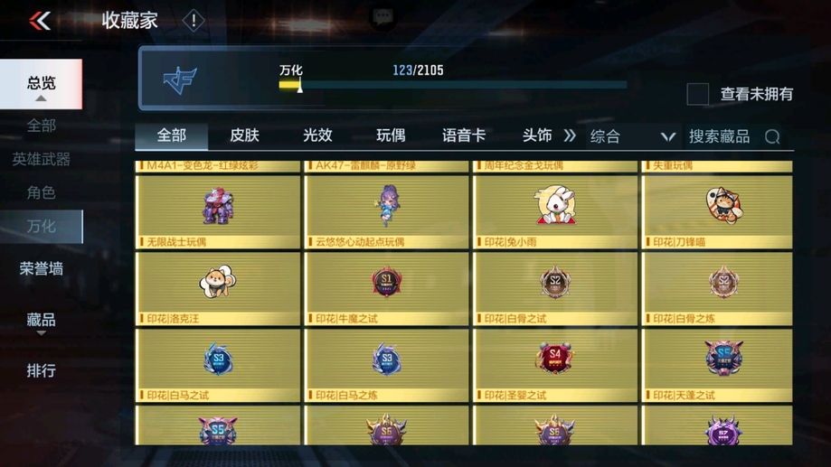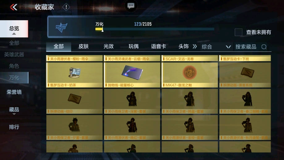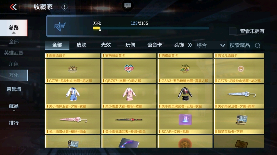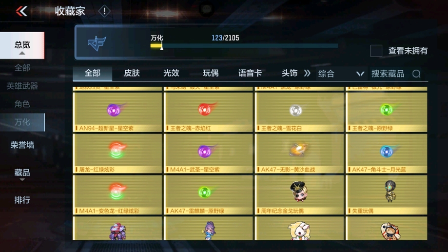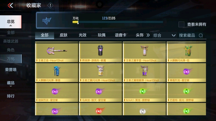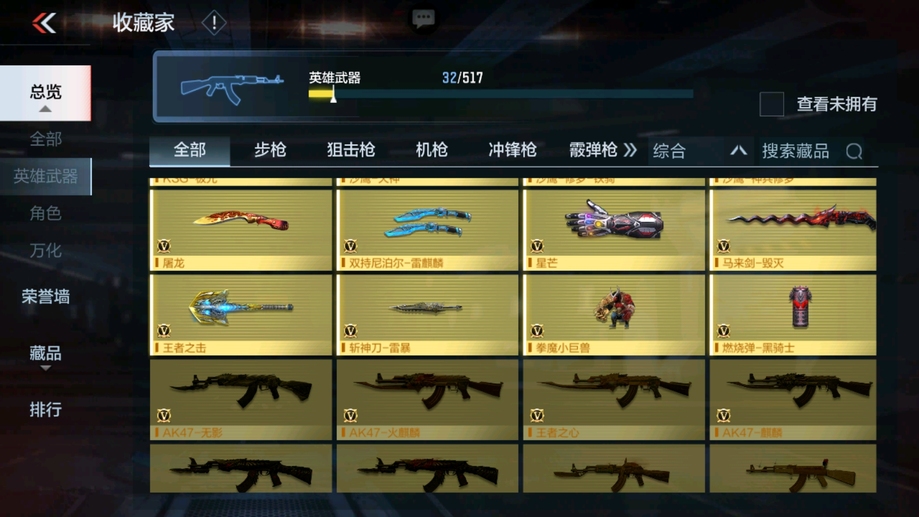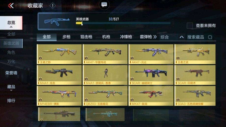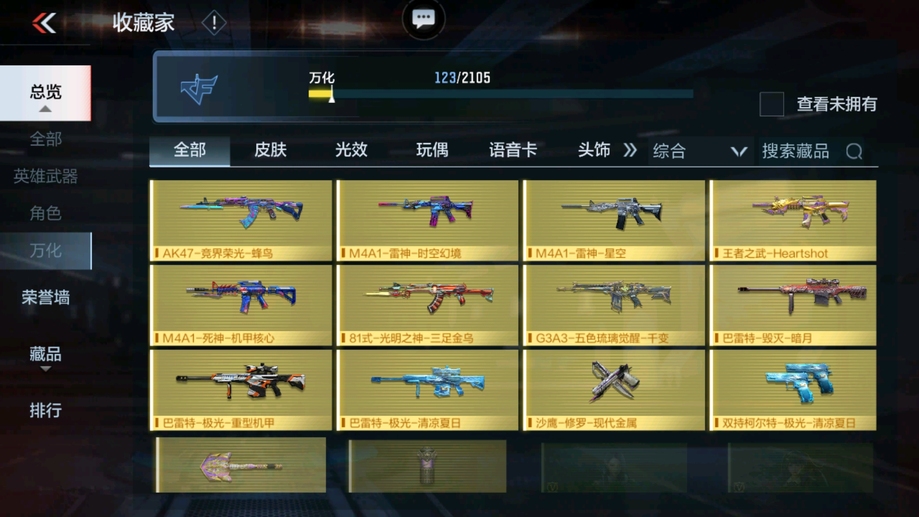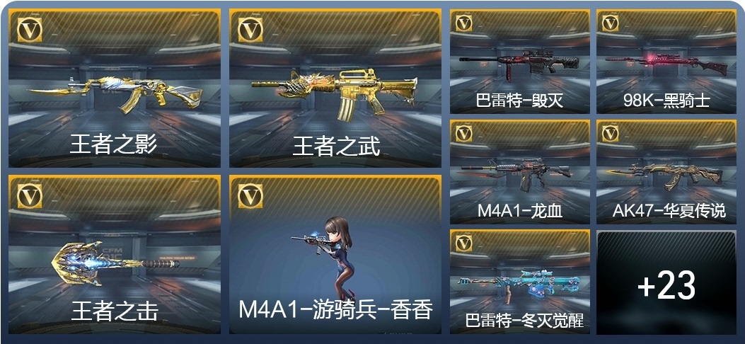 M4A1-遊騎兵-香香,M4A1-龍血,AK47-華夏傳說,SCAR-幽暗騎士,巴雷特-毀滅,98K-黑騎士,巴雷特-冬滅覺醒,M200-心動次元覺醒,地獄火,沙鷹-修羅-鐵騎,沙鷹-天神,馬來劍-毀滅,斬神刀-雷暴,拳魔小巨獸,星芒,屠龍