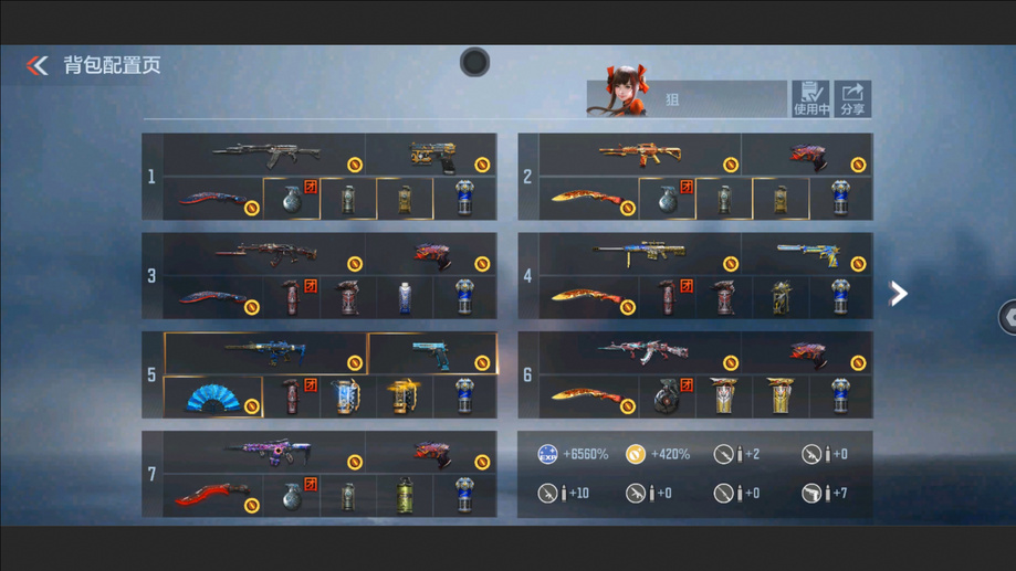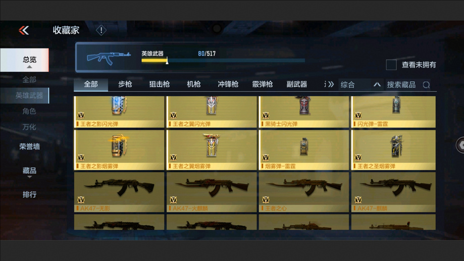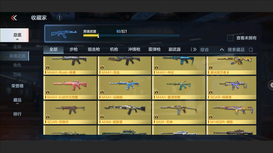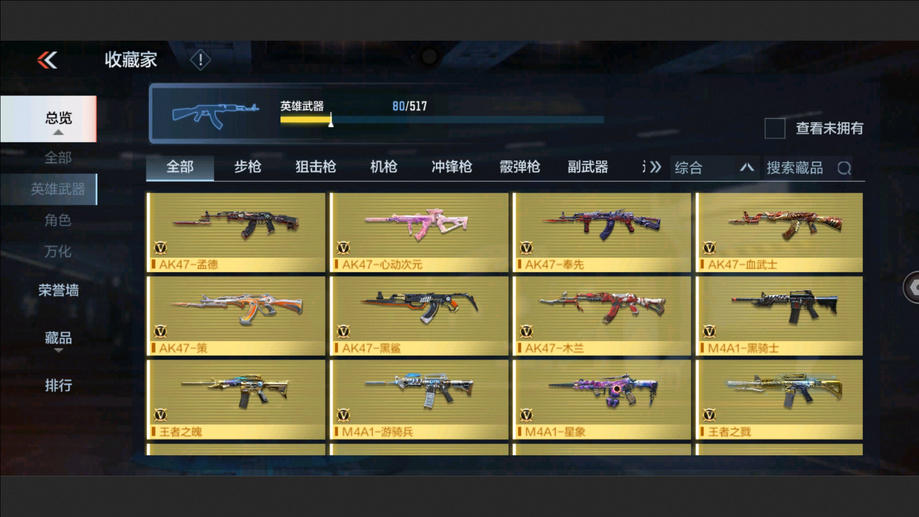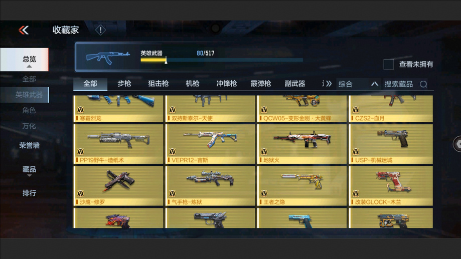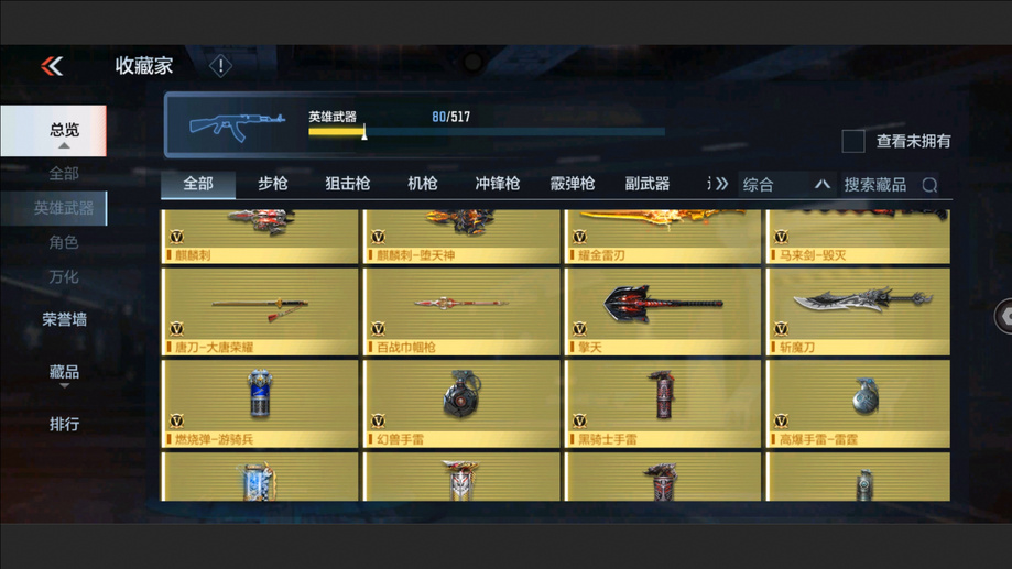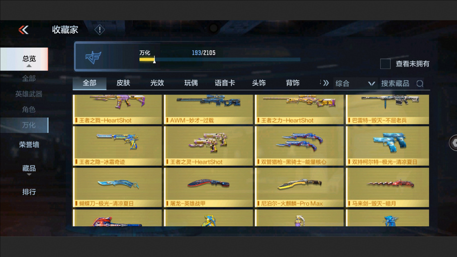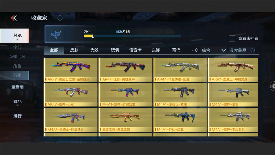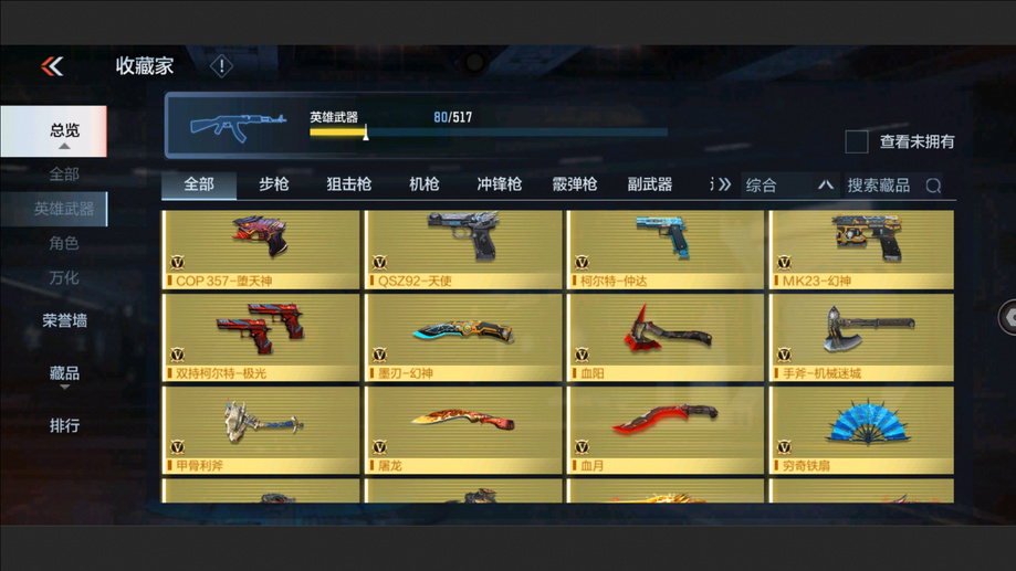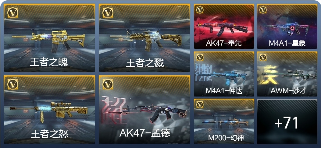AK47-孟德,M4A1-星象,AK47-奉先,M4A1-仲達,M200-幻神,AWM-妙才,AK47-策,TAC-慈,COP 357-墮天神,M4A1-黑騎士,M4A1-遊騎兵,AK47-木蘭,巴雷特-雷霆,巴雷特-毀滅,巴雷特-極光,AWM-天使,雙持斯泰爾-天使,VEPR12-宙斯,AK47-心動次元,AK47-黑鯊,AK47-血武士,M4A1-心動次元覺醒,M4A1-Rush-夜襲,M4A1-夏清覺醒,M4A1-運輸船,M4A1-龍血,巴雷特-冬滅覺醒,9A91-天神,SCAR-探星者,AN94-超新星,鐳射毀滅者Ⅲ,SKS-美杜莎,寒霜烈龍,地獄火,氣手槍-煉獄,柯爾特-仲達,MK23-幻神,墨刃-幻神,窮奇鐵扇,USP-機械迷城,沙鷹-修羅,改裝GLOCK-木蘭,雙持柯爾特-極光,QSZ92-天使,馬來劍-毀滅,百戰巾幗槍,擎天,麒麟刺-墮天神,手斧-機械迷城,唐刀-大唐榮耀,耀金雷刃,斬魔刀,麒麟刺,甲骨利斧,血月,血陽,屠龍,煙霧彈-雷霆,閃光彈-雷霆,高爆手雷-雷霆,黑騎士閃光彈,黑騎士手雷,幻獸手雷,燃燒彈-遊騎兵