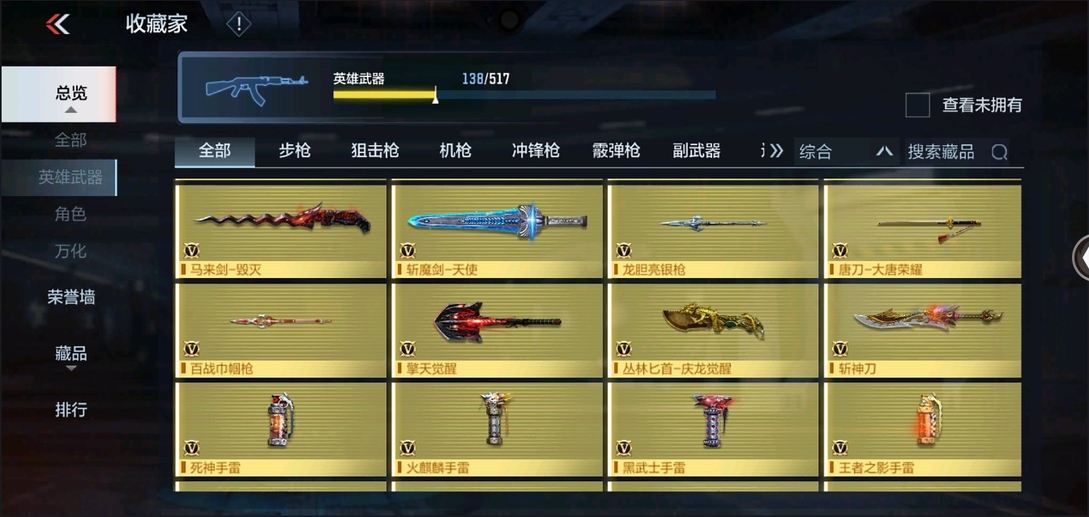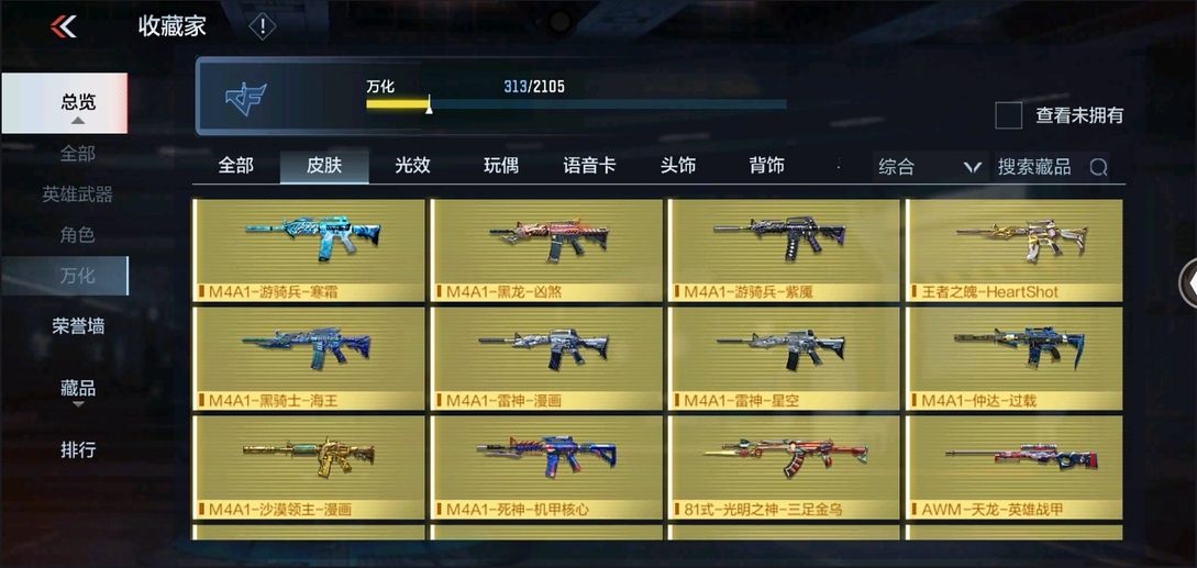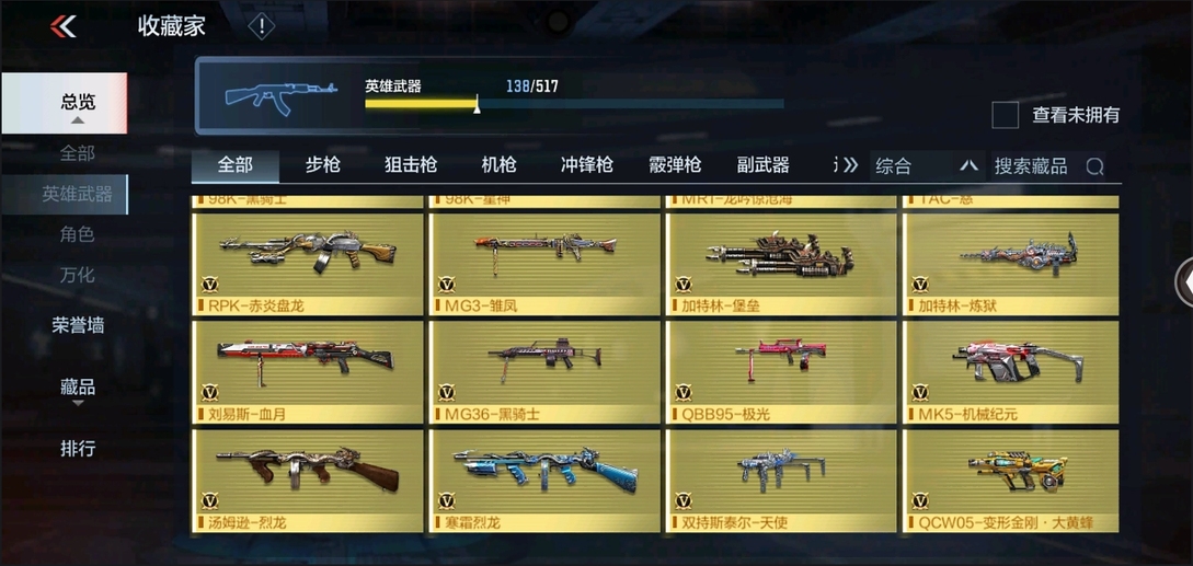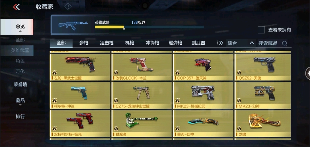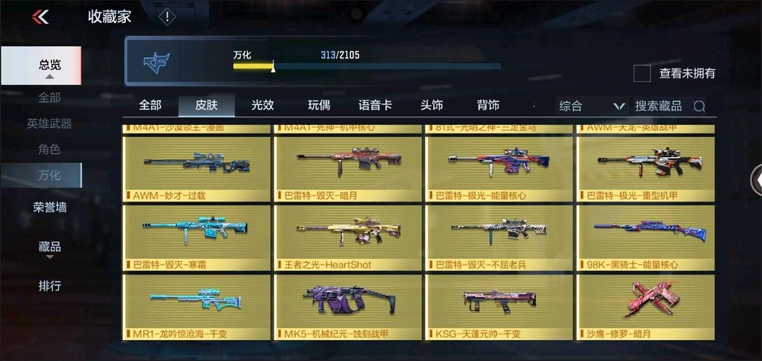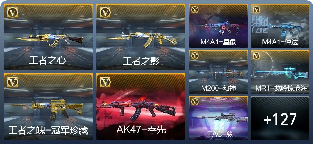 AK47-奉先,M4A1-星象,M4A1-仲達,M200-幻神,TAC-慈,MR1-龍吟驚滄海,加特林-煉獄,KSG-天蓬元帥,COP 357-墮天神,AK47-火麒麟,AK47-無影,AK47-黑武士覺醒,AK47-遊騎兵,AK47-無影-葵,M4A1-死神,M4A1-遊騎兵,M4A1-黑龍,M4A1-雷神,AK47-木蘭,巴雷特-毀滅,巴雷特-極光-運動寶貝蘭,巴雷特-極光,巴雷特-雷神,巴雷特-雷霆,9A91-死神,G36-機械紀元,81式-機械紀元,AWM-天使,98K-黑騎士,MG36-黑騎士,MK5-機械紀元,雙持斯泰爾-天使,AK47-沙漠領主,AK47-冰魂覺醒,AK47-沙漠郡主-超覺,AK47-血武士,AK47-黑鯊,M4A1-君威GS,M4A1-沙漠領主,M4A1-玫瑰精靈,M4A1-Rush-夜襲,M4A1-運輸船,M4A1-海騎士,M4A1-賽博雷神,M4A1-龍血,巴雷特-冬滅覺醒,巴雷特-槍娘,M14EBR-暗夜,SCAR-探星者,AN94-超新星,SCAR-幽暗騎士,AWM-賽博時代,AWM-天龍,SKS-美杜莎,09式狙-天神,寒霜烈龍,劉易斯-血月,湯姆遜-烈龍,加特林-堡壘,RPK-赤炎盤龍,MG3-雛鳳,地獄火,地獄烈炎,CZS2-心動次元覺醒,柯爾特-仲達,MK23-幻神,墨刃-幻神,龍膽亮銀槍,沙鷹-修羅,沙鷹-火麒麟,雙持柯爾特-極光,左輪-黑武士覺醒,改裝GLOCK-木蘭,QSZ92-天使,MK23-機械紀元,尼泊爾-機械紀元,手斧-機械迷城,尼泊爾-雷霆,麒麟刺-墮天神,百戰巾幗槍,馬來劍-毀滅,擎天覺醒,斬魔劍-天使,USP-神罰,沙鷹-天神,弒魔者,神罰戰斧,血月,屠龍,耀金雷刃,星芒,麒麟刺,唐刀-大唐榮耀,叢林匕首-慶龍覺醒,斬神刀,黑武士手雷,黑武士閃光彈,黑武士煙霧彈,火麒麟手雷,火麒麟煙霧彈,火麒麟閃光彈,燃燒彈-遊騎兵,死神手雷,死神閃光彈,死神煙霧彈