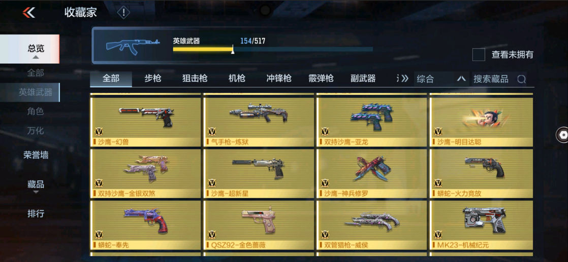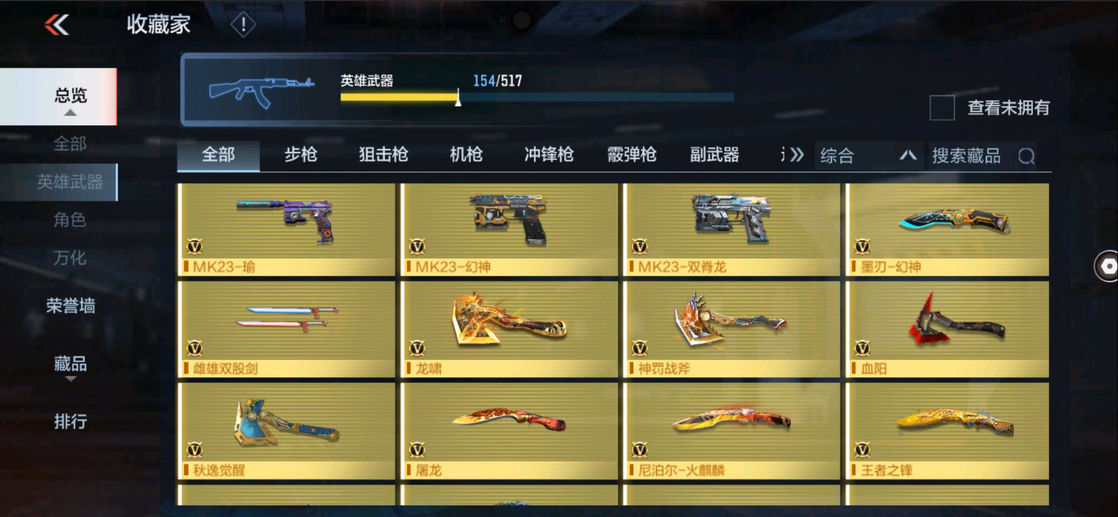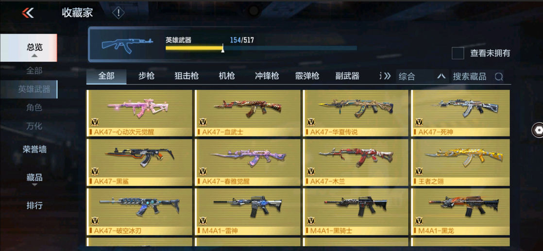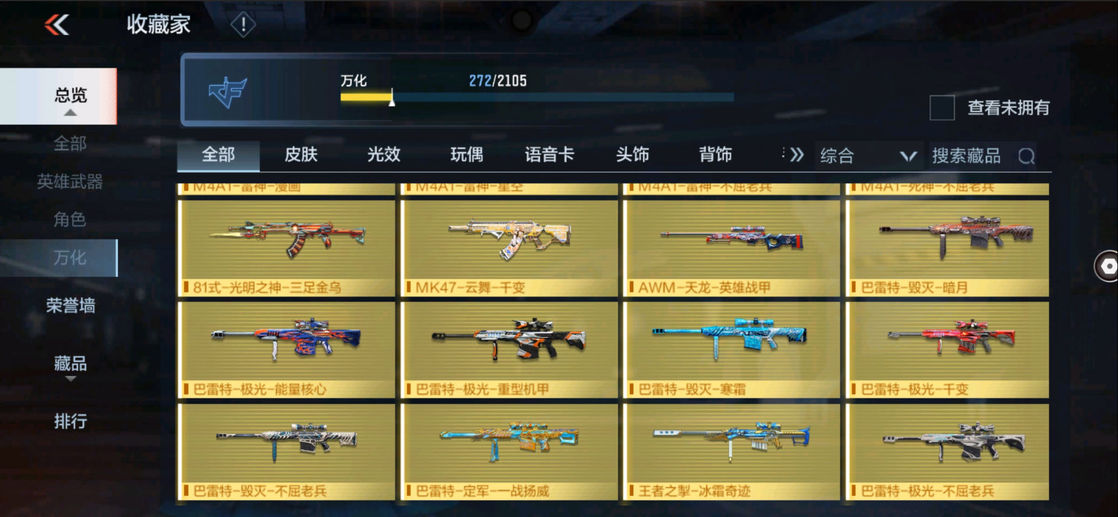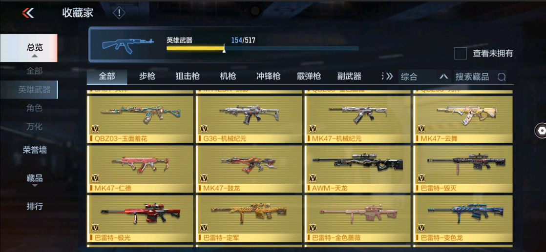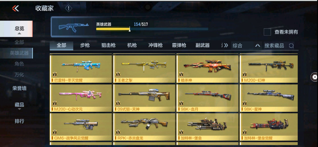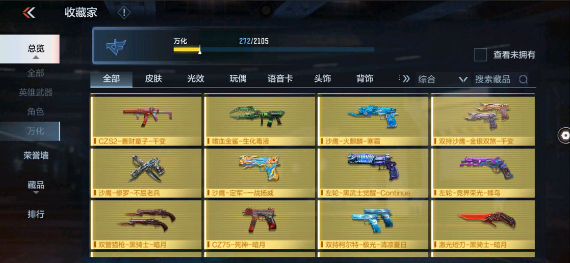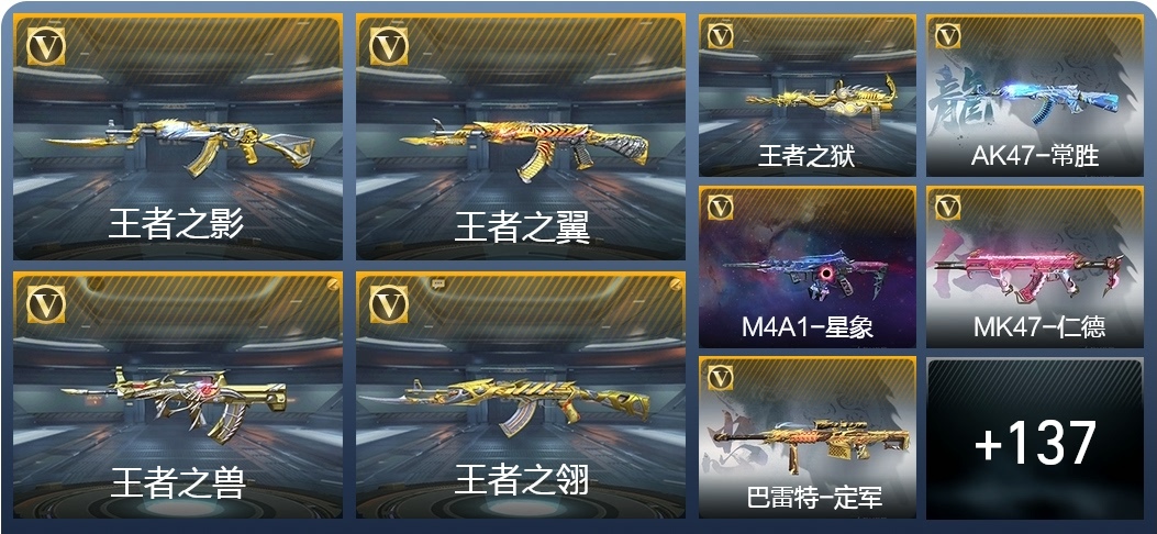 MK47-仁德,巴雷特-定軍,AK47-常勝,M4A1-星象,M200-幻神,MK47-雲舞,AN94-捲簾大將軍,CZS2-善財童子,巴雷特-金色薔薇,巴雷特-變色龍,巴雷特-極光,巴雷特-毀滅,M4A1-黑騎士,M4A1-雷神,M4A1-黑龍,AK47-木蘭,AK47-死神,AK47-無影,AK47-天使,AK47-火麒麟,AK47-變色龍,M4A1-死神,M4A1-競界榮光,M4A1-墮天神,MK47-機械紀元,G36-機械紀元,QBZ03-金色薔薇,QBZ03-死神,AUG-機械紀元,P90-雙脊龍,斯泰爾-幻獸,雙持斯泰爾-天使,M12S-雷霆,AA12-競界榮光,亡命之徒-幻獸,AK47-黑鯊,AK47-華夏傳說,AK47-春雅覺醒,AK47-心動次元覺醒,AK47-血武士,AK47-沙漠郡主-一覺,AK47-沙漠郡主-超覺,AK47-沙漠郡主-二覺,AK47-幸運日,AK47-幸運日覺醒,M4A1-心動次元,M4A1-運輸船,M4A1-海騎士,M4A1-獵神,M4A1-賽博雷神,巴雷特-冬滅覺醒,AWM-天龍,9A91-天神,SCAR-幽暗騎士,SCAR-幽暗騎士覺醒,SCAR-探星者,GM6-戰爭風雲覺醒,暗殺神,98K-血月,M200-心動次元,09式狙-天神,地獄火,地獄烈炎,嗜血金鯊,地獄烈櫻·一覺,KSG-火力競放,CZS2-心動次元覺醒,加特林-蟒蛇,加特林-堡壘,RPK-赤炎盤龍,加特林-堡壘覺醒,USP-仁德,MK23-幻神,MK23-瑜,雙管獵槍-威侯,氣手槍-煉獄,蟒蛇-奉先,雙持沙鷹-金銀雙煞,鐵鍬-孟德,墨刃-幻神,雌雄雙股劍,虛空之槌-妙才,沙鷹-修羅,沙鷹-火麒麟,MK23-雙脊龍,QSZ92-金色薔薇,MK23-機械紀元,沙鷹-幻獸,沙鷹-明目達聰,雙脊龍趾,馬來劍-毀滅,擎天覺醒,尼泊爾-雷霆,尼泊爾-火麒麟,斬神刀-雷暴,USP-神罰,蟒蛇-火力競放,雙持沙鷹-亞龍,唐刀-大唐榮耀,星芒,雙持尼泊爾-亞龍,血月,龍嘯,神罰戰斧,血陽,屠龍,迷你究極泰坦,叢林匕首-火力競放,高爆手雷-墮天神,閃光彈-墮天神,煙霧彈-墮天神,煙霧彈-雷霆,黑騎士手雷,黑騎士閃光彈,黑騎士煙霧彈,黑武士手雷,黑武士閃光彈,燃燒彈-遊騎兵,死神手雷,手雷-競界榮光