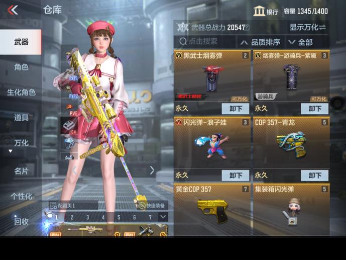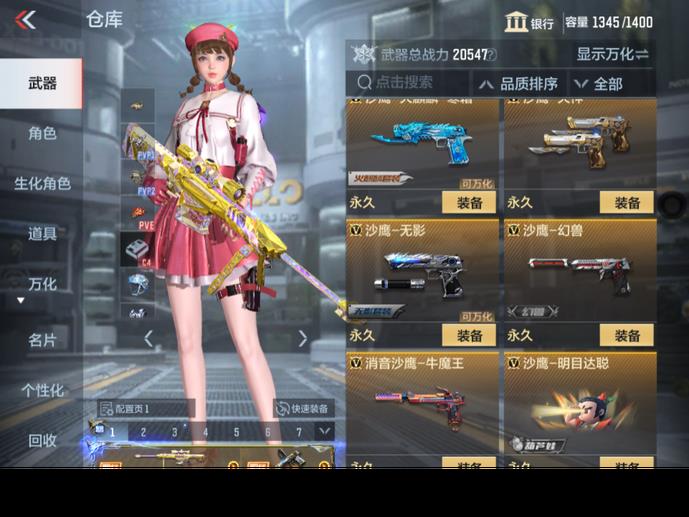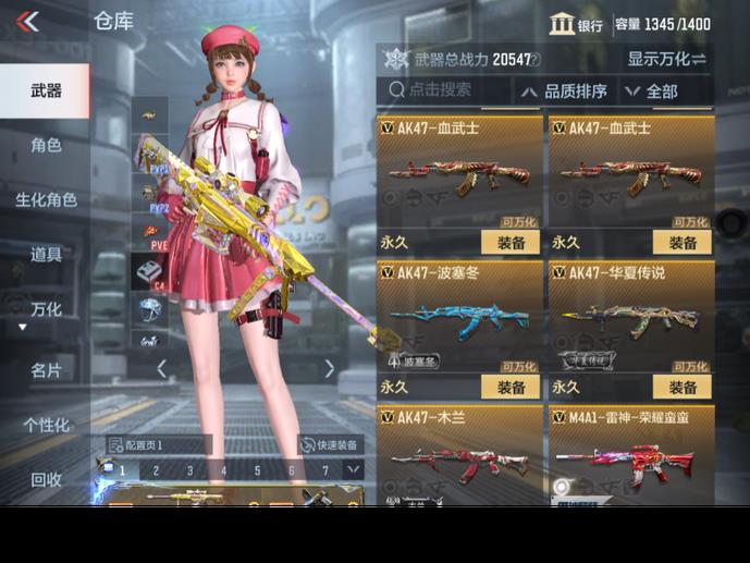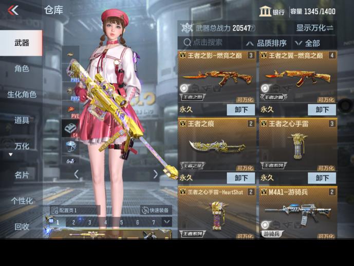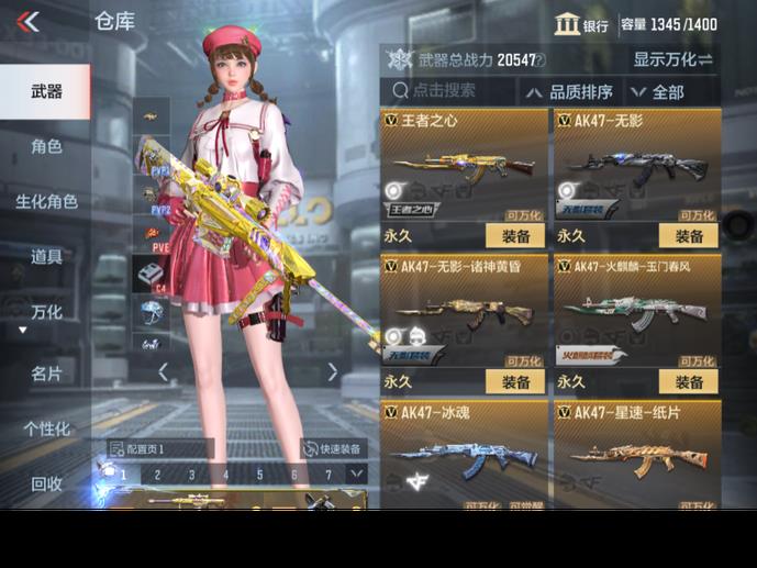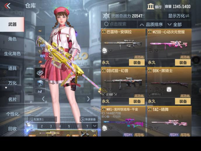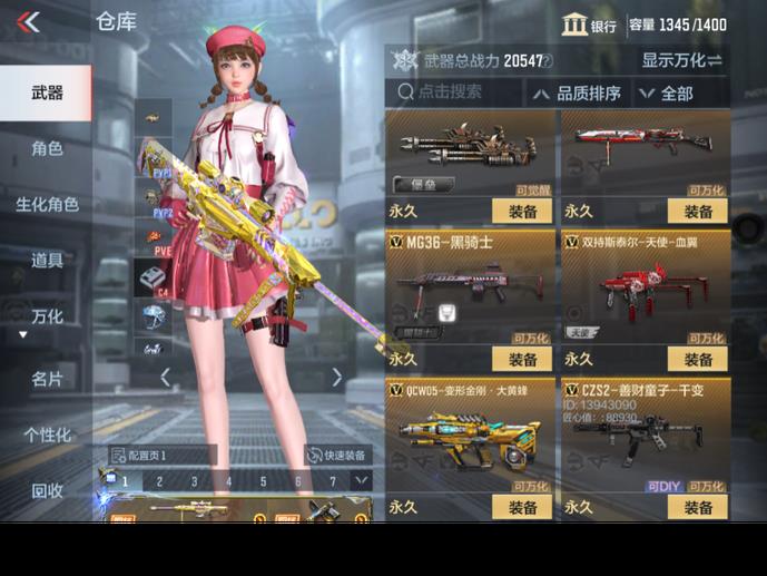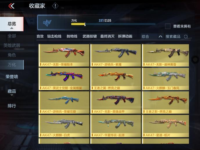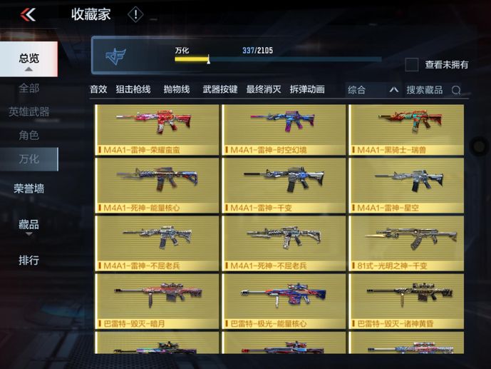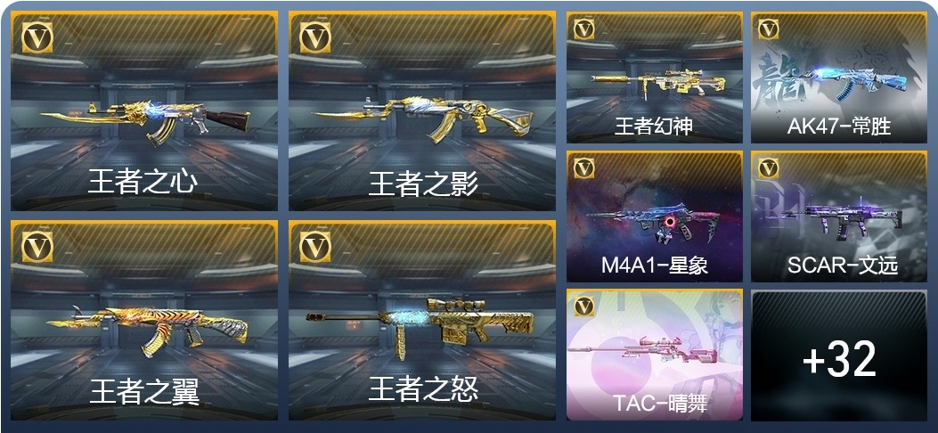 M4A1-星象,AK47-常勝,SCAR-文遠,M4A1-遊騎兵,M4A1-雷神,M4A1-黑騎士,M4A1-死神,AK47-木蘭,AK47-火麒麟,AK47-雷麒麟,AK47-無影,AK47-雷暴,AK47-血武士,巴雷特-毀滅,巴雷特-極光,巴雷特-安琪拉,98K-黑騎士,09式狙-幻獸,M200-心動次元,TAC-晴舞,QBZ03-金色薔薇,MK47-機械紀元,雙持斯泰爾-天使,地獄火,毀滅征服者-超越Max,COP 357-星象,MK23-機械紀元,雙管獵槍-威侯,虎頭湛金槍,三叉戟-波塞冬,唐刀-大唐榮耀