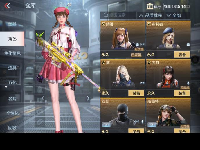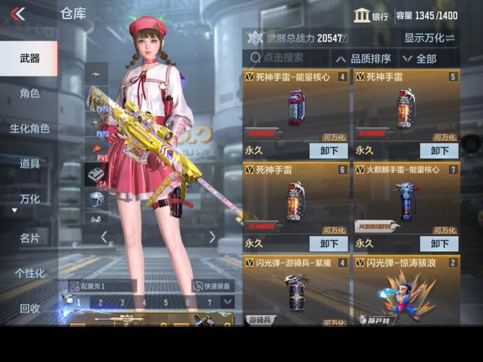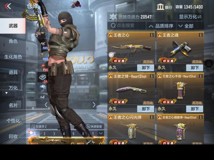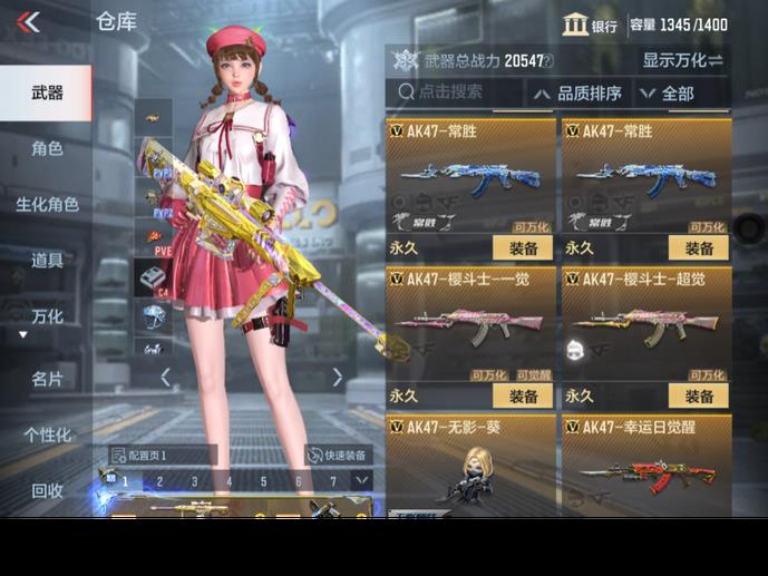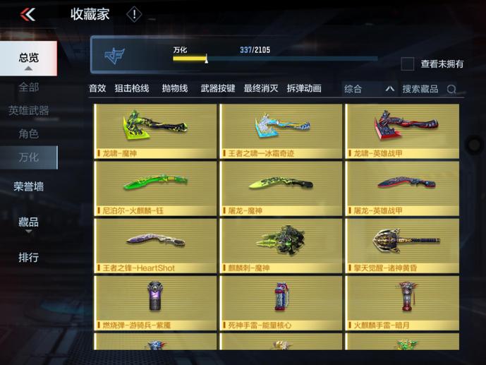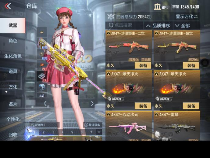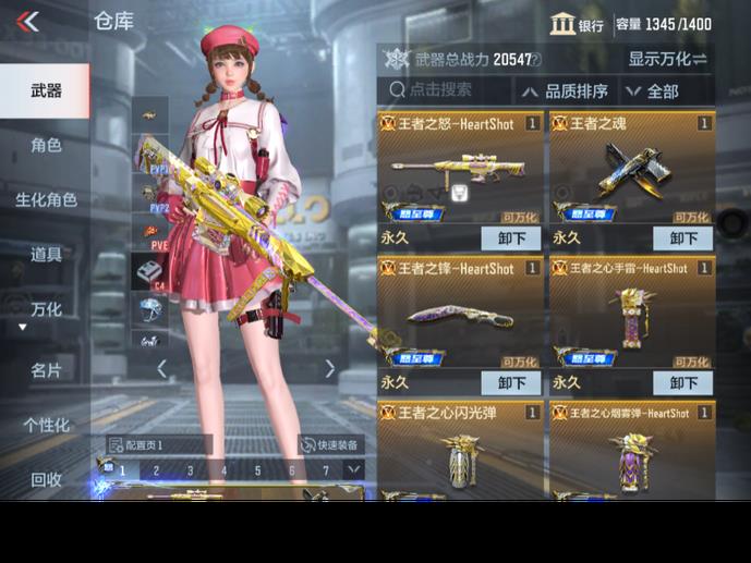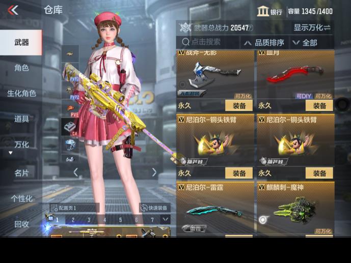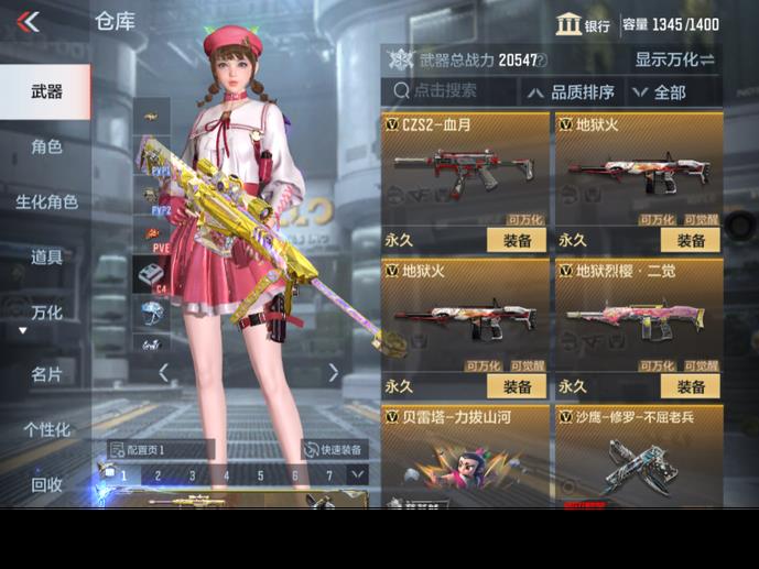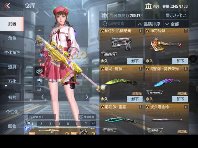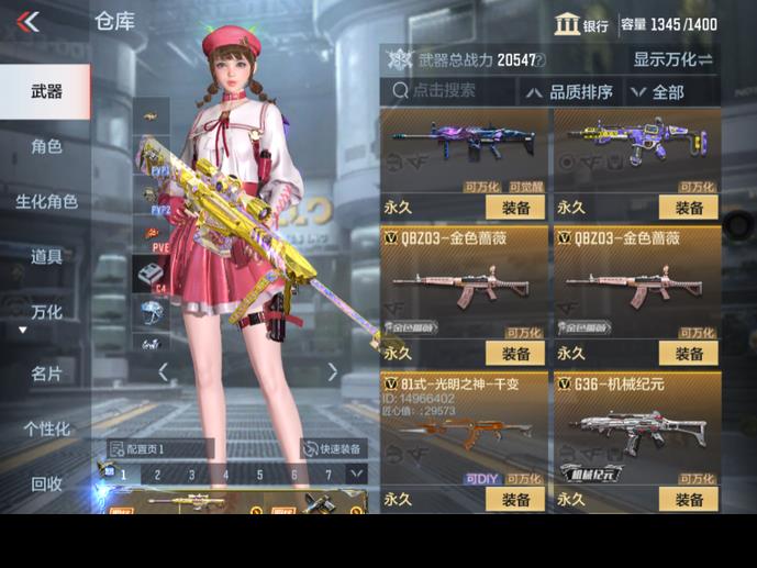 M4A1-星象,AK47-常勝,SCAR-文遠,M4A1-遊騎兵,M4A1-雷神,M4A1-黑騎士,M4A1-死神,AK47-木蘭,AK47-火麒麟,AK47-雷麒麟,AK47-無影,AK47-雷暴,AK47-血武士,巴雷特-毀滅,巴雷特-極光,巴雷特-安琪拉,98K-黑騎士,09式狙-幻獸,M200-心動次元,TAC-晴舞,QBZ03-金色薔薇,MK47-機械紀元,雙持斯泰爾-天使,地獄火,毀滅征服者-超越Max,COP 357-星象,MK23-機械紀元,雙管獵槍-威侯,虎頭湛金槍,三叉戟-波塞冬,唐刀-大唐榮耀
