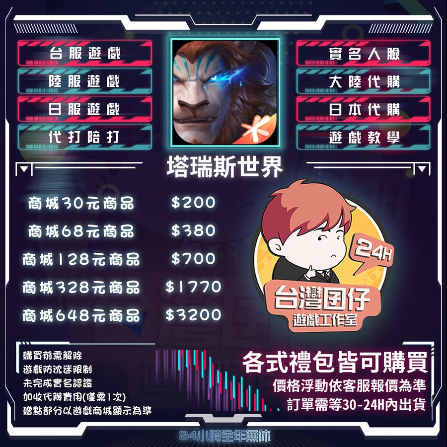 代儲【人民幣68元商品=380元】 🏆24H客服🏆現貨秒出🔥塔瑞斯世界台灣囝仔🔥陸服🔥20萬保證金