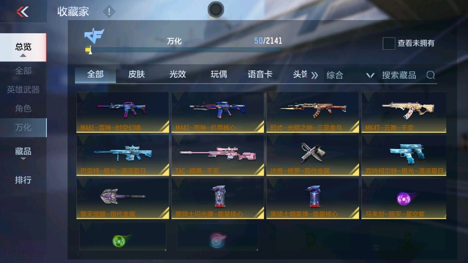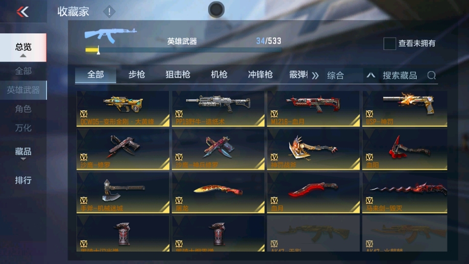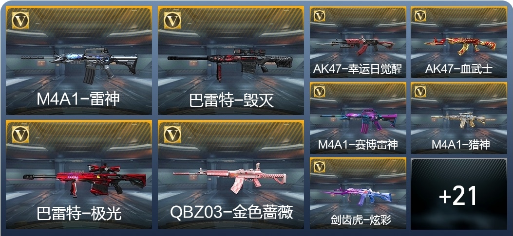 巴雷特-毀滅,巴雷特-極光,M4A1-雷神,QBZ03-金色薔薇,AK47-血武士,AK47-幸運日覺醒,M4A1-賽博雷神,M4A1-獵神,M200-心動次元覺醒,9A91-天神,劍齒虎-炫彩,沙鷹-修羅,手斧-機械迷城,馬來劍-毀滅,USP-神罰,血陽,血月,神罰戰斧,屠龍,黑騎士煙霧彈,黑騎士閃光彈