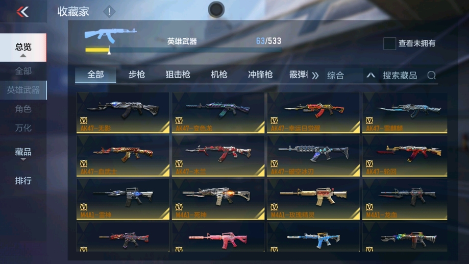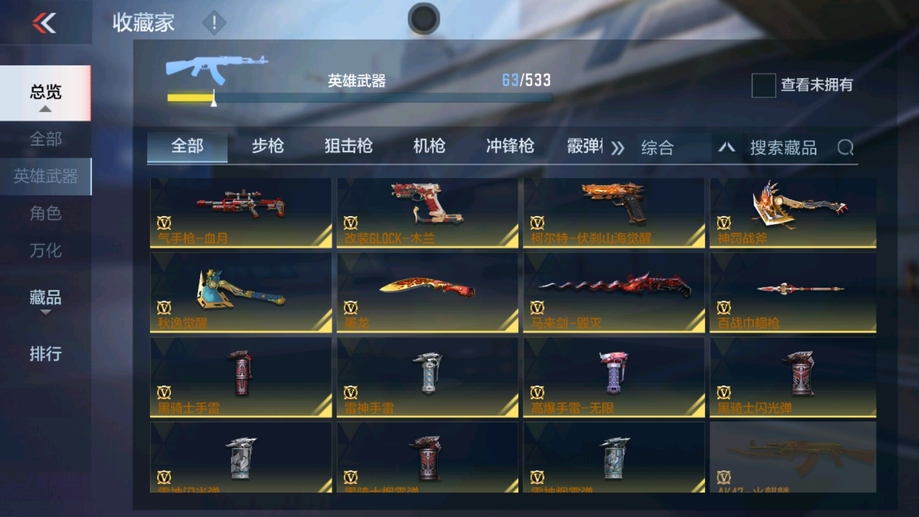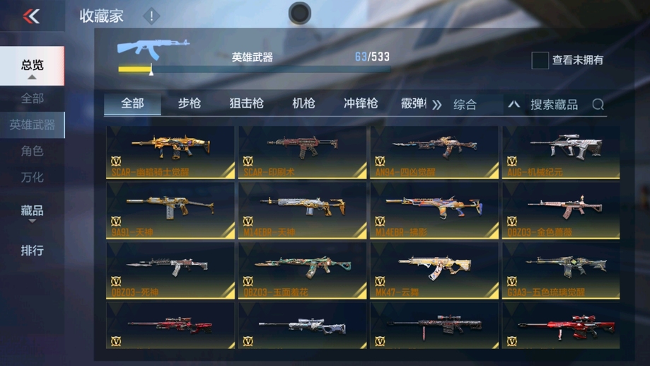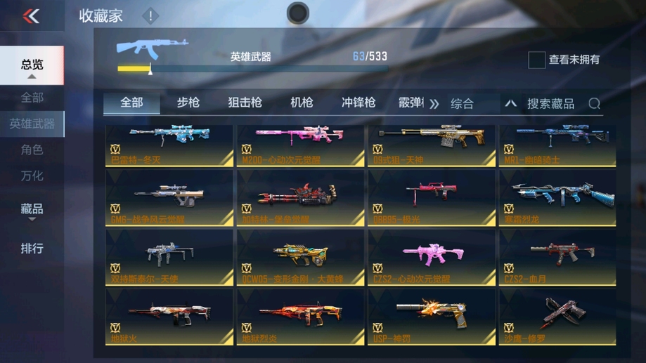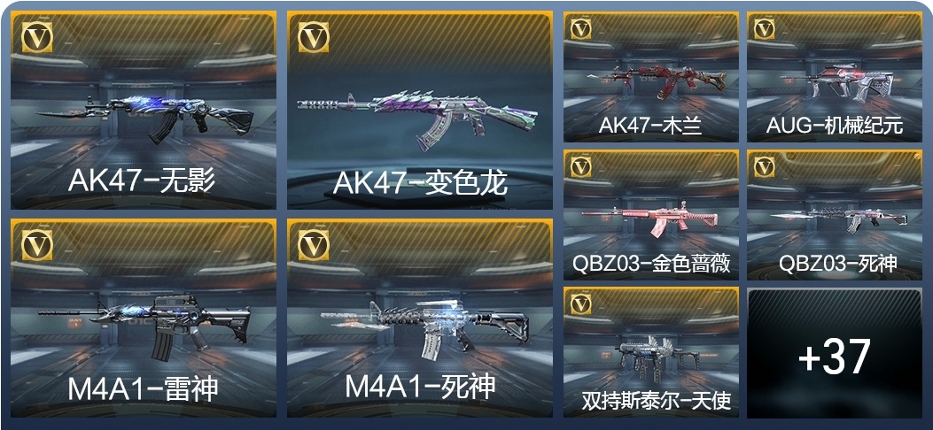 AK47-木蘭,AK47-變色龍,M4A1-死神,AK47-無影,M4A1-雷神,QBZ03-死神,AUG-機械紀元,QBZ03-金色薔薇,AK47-雷麒麟,AK47-幸運日覺醒,AK47-血武士,M4A1-龍血,M4A1-玫瑰精靈,9A91-天神,M14EBR-天神,巴雷特-冬滅,M200-心動次元覺醒,09式狙-天神,GM6-戰爭風雲覺醒,加特林-堡壘覺醒,雙持斯泰爾-天使,寒霜烈龍,CZS2-心動次元覺醒,地獄烈炎,地獄火,沙鷹-修羅,改裝GLOCK-木蘭,USP-神罰,馬來劍-毀滅,百戰巾幗槍,神罰戰斧,黑騎士閃光彈,黑騎士手雷