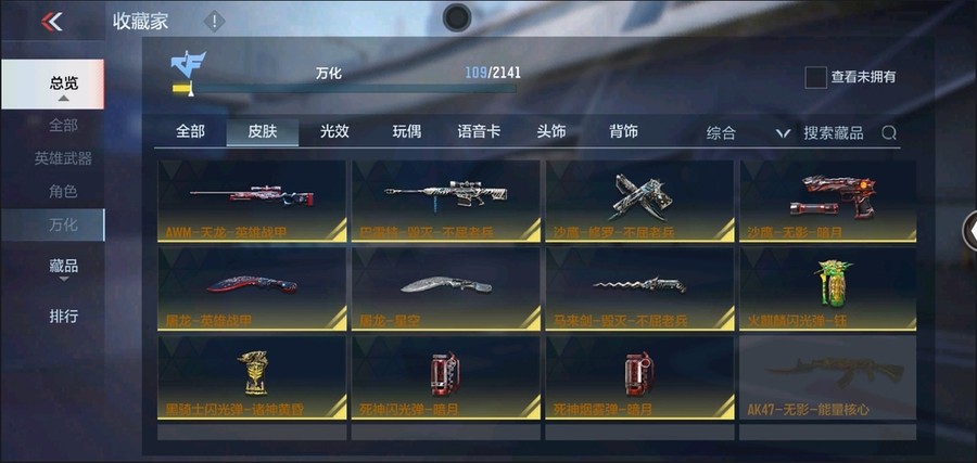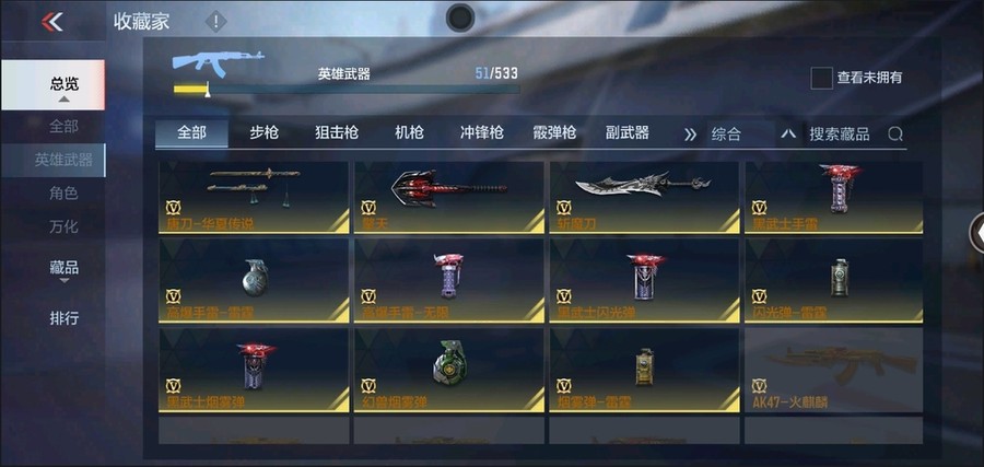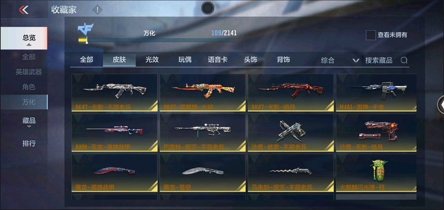 81式-光明之神,M4A1-死神,AK47-木蘭,AK47-無影,AK47-黑武士,M4A1-雷神,AK47-變色龍,巴雷特-毀滅,巴雷特-極光,98K-黑騎士,QBZ03-死神,雙持斯泰爾-天使,M4A1-龍血,AK47-雷麒麟,AK47-黑鯊,AK47-血武士,巴雷特-冬滅,M4A1-獵神,9A91-天神,左輪-黑武士,改裝GLOCK-木蘭,沙鷹-修羅,尼泊爾-冰鋒覺醒,斬魔劍-天使,馬來劍-毀滅,擎天,屠龍,麒麟刺,唐刀-華夏傳說,唐刀-大唐榮耀,斬魔刀,高爆手雷-雷霆,閃光彈-雷霆,煙霧彈-雷霆,黑武士手雷,黑武士煙霧彈,黑武士閃光彈,幻獸煙霧彈