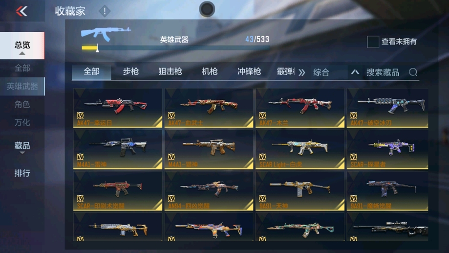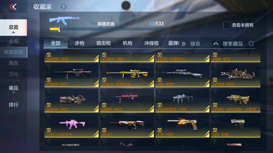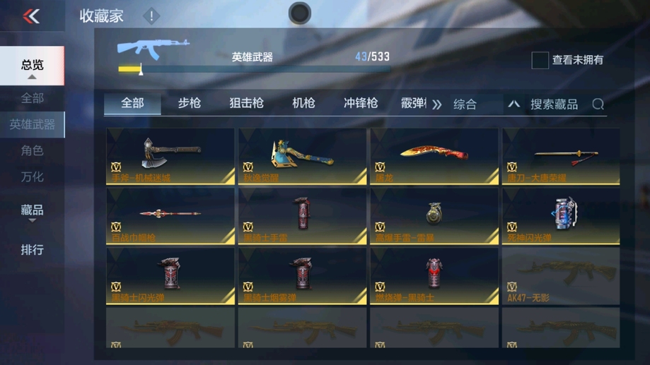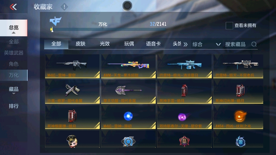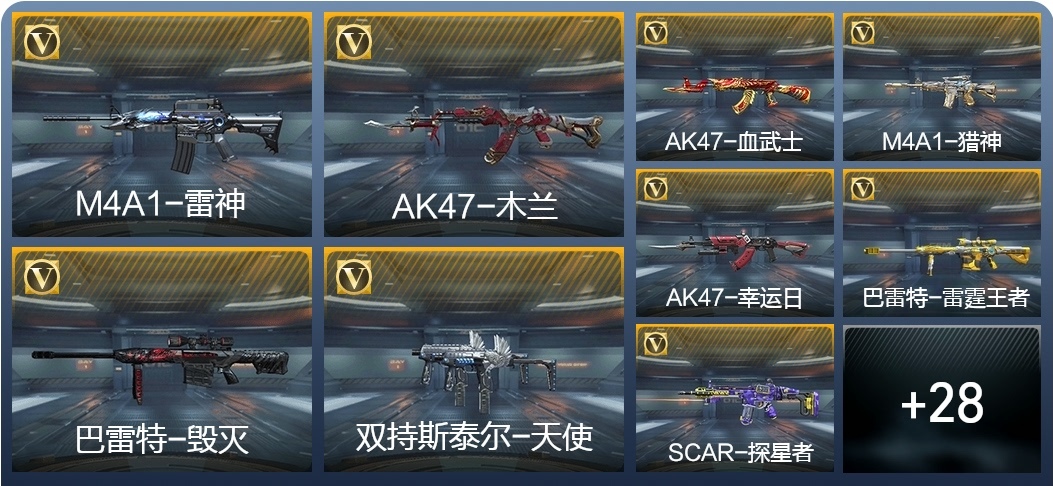 AK47-木蘭,M4A1-雷神,AK47-血武士,AK47-幸運日,M4A1-獵神,M14EBR-天神,9A91-天神,SCAR-探星者,巴雷特-毀滅,AWM-天龍,加特林-堡壘,加特林-蟒蛇,雙持斯泰爾-天使,CZS2-心動次元,地獄火,USP-雷暴,USP-神罰,百戰巾幗槍,手斧-機械迷城,唐刀-大唐榮耀,屠龍,高爆手雷-雷暴,黑騎士閃光彈,黑騎士手雷,黑騎士煙霧彈,死神閃光彈