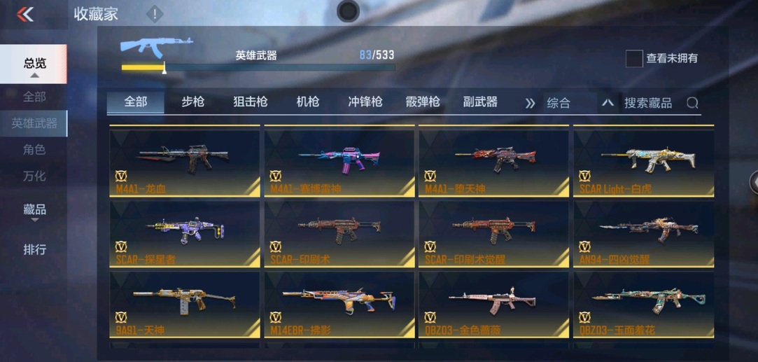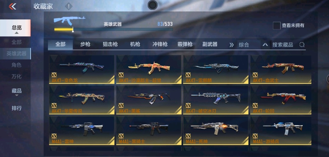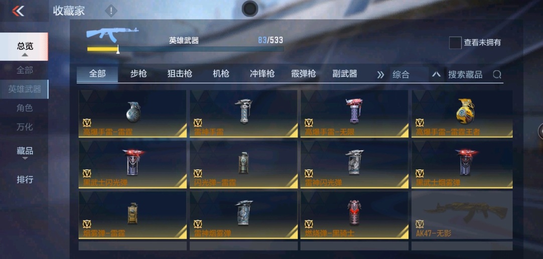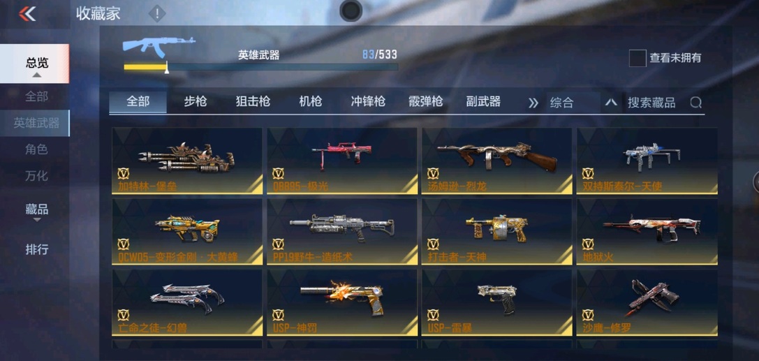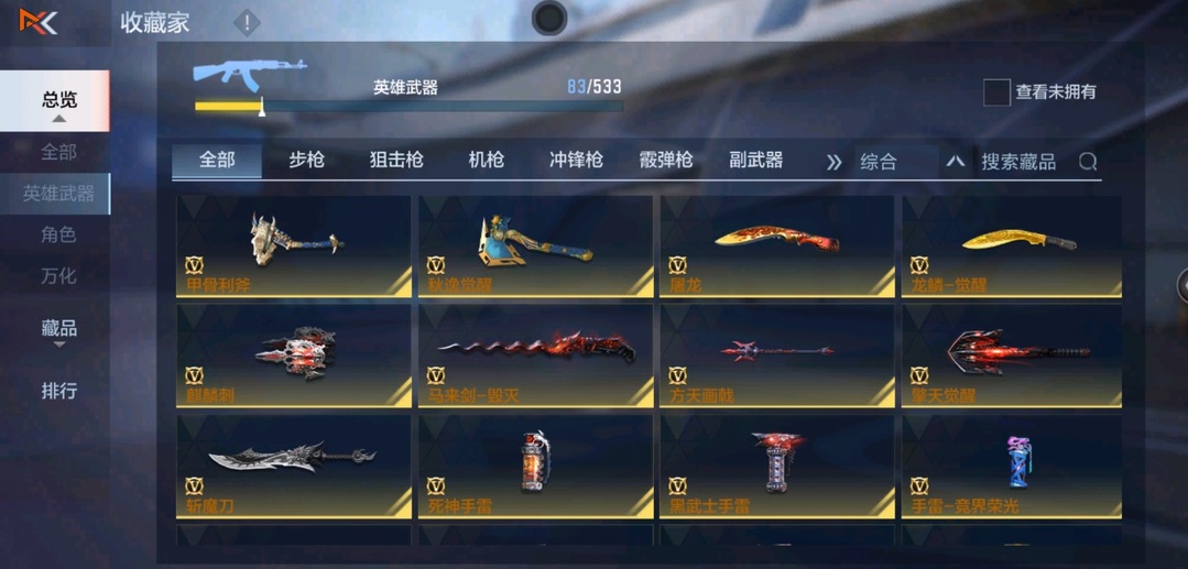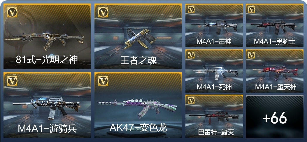 81式-光明之神,M4A1-墮天神,M4A1-遊騎兵,M4A1-死神,M4A1-黑騎士,M4A1-雷神,AK47-變色龍,巴雷特-毀滅,巴雷特-極光,巴雷特-雷霆,QBZ03-金色薔薇,98K-黑騎士,雙持斯泰爾-天使,亡命之徒-幻獸,M4A1-龍血,AK47-血武士,AK47-雷麒麟,AK47-黑鯊,AK47-華夏傳說,9A91-天神,SCAR-探星者,AWM-天龍,加特林-堡壘,湯姆遜-烈龍,地獄火,MK23-幻神,蟒蛇-奉先,方天畫戟,USP-雷暴,沙鷹-修羅,擎天覺醒,馬來劍-毀滅,手斧-機械迷城,USP-神罰,甲骨利斧,麒麟刺,斬魔刀,屠龍,神罰戰斧,血陽,閃光彈-雷霆,煙霧彈-雷霆,高爆手雷-雷霆,黑武士煙霧彈,黑武士閃光彈,黑武士手雷,死神手雷,手雷-競界榮光