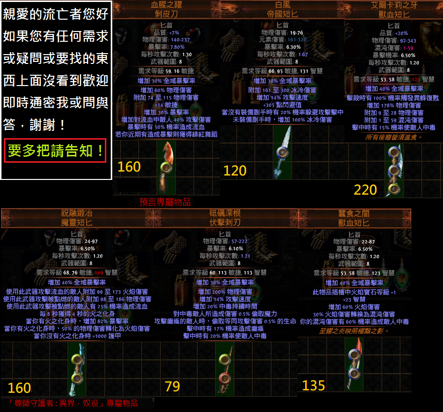在交易時請放上一件您不需要的物品。例如武器、防具、技能石、地圖、材料、捲軸....等等