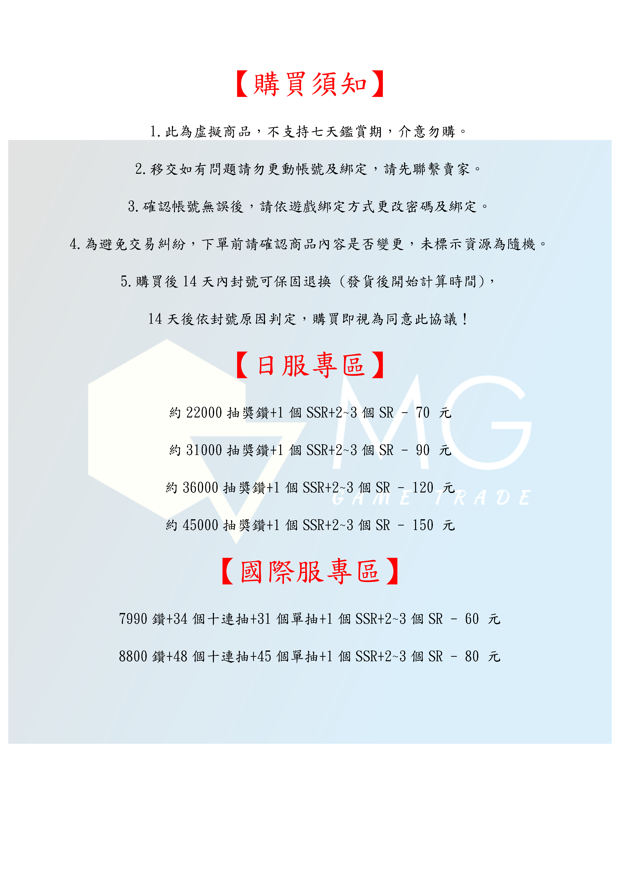 帳號 【初始號】 【MG數碼】 日服 國際服 多石號 多鑽石號 初始號 自抽號 自選號