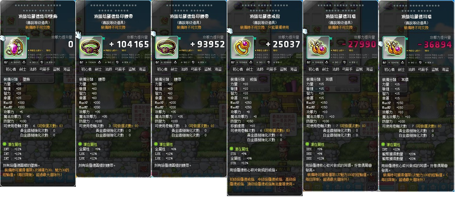 道具 【頂培】 36%智頂墜、雙楓12%智、30%力頂戒、30%敏頂耳、33%幸頂腰/30%幸