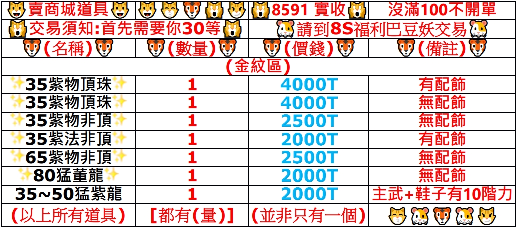 道具 😽金光貓商人😼😺(35紫龍~80董龍)😺