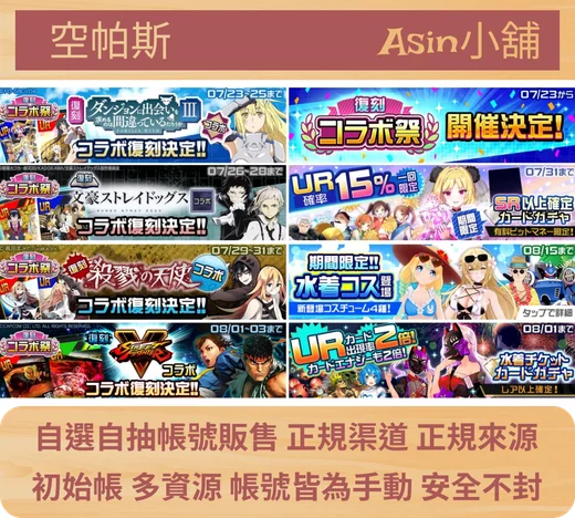 每個帳號至少有40000BM+隨機0-5UR等資源,至少有一張週年英雄(週年英雄包含桐人亞斯娜,禦坂美琴一方通行)