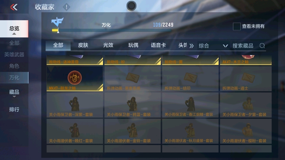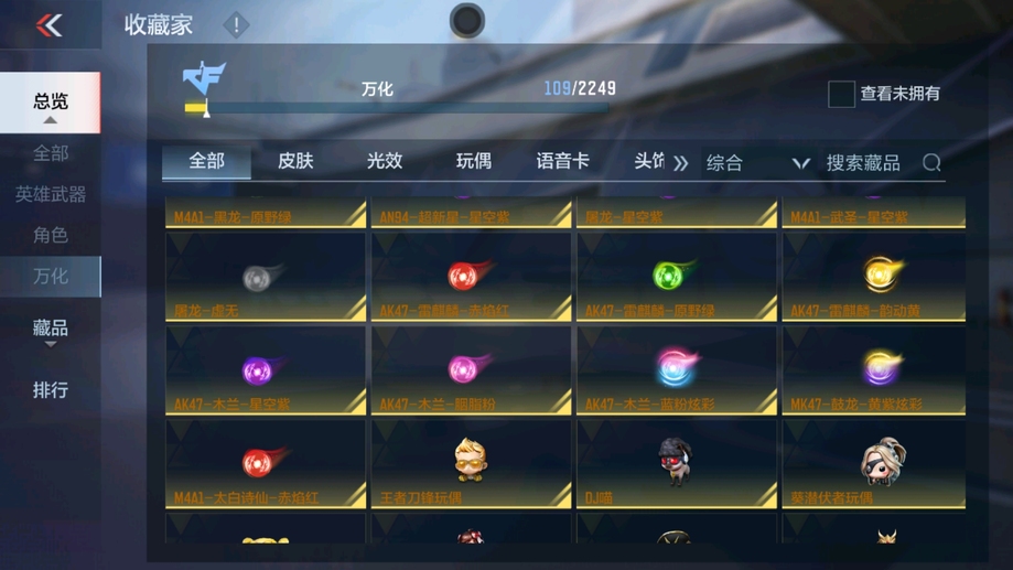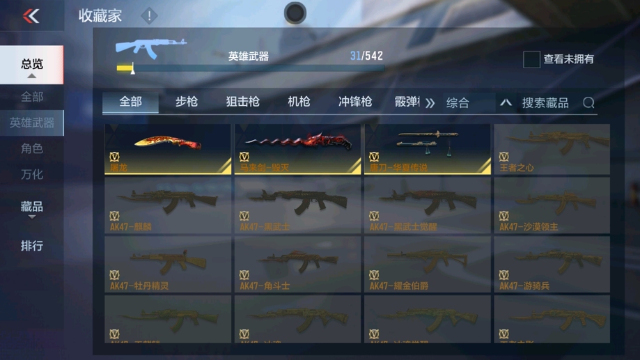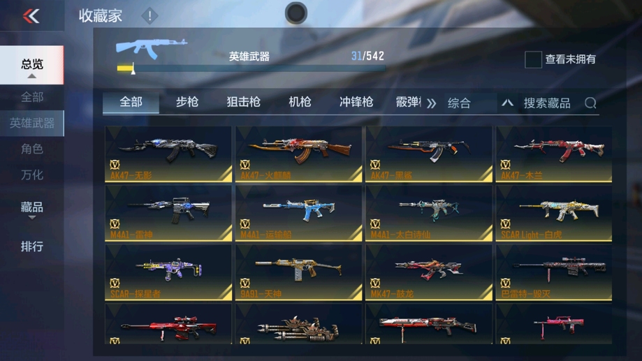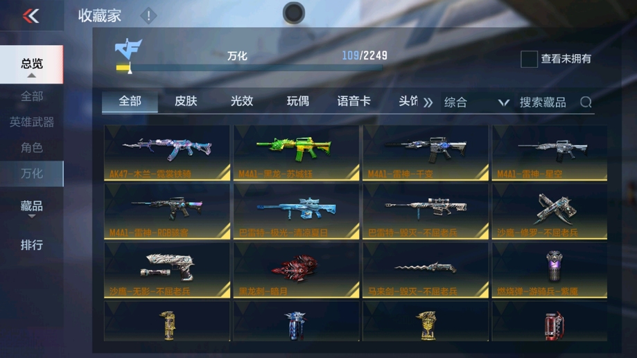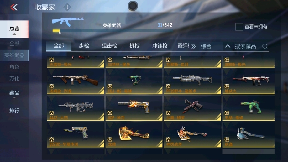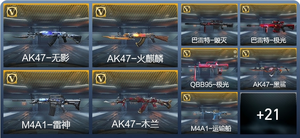 M4A1-雷神,AK47-火麒麟,AK47-木蘭,巴雷特-毀滅,AK47-無影,巴雷特-極光,AK47-黑鯊,M4A1-運輸船,9A91-天神,SCAR-探星者,MK47-鼓龍,加特林-堡壘,PP19野牛-造紙術,湯姆遜-烈龍,地獄火,劉易斯-血月,M4A1-太白詩仙,沙鷹-修羅,馬來劍-毀滅,USP-神罰,唐刀-華夏傳說,屠龍,神罰戰斧,龍嘯,QSZ92-華夏傳說,SCAR Light-白虎