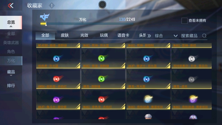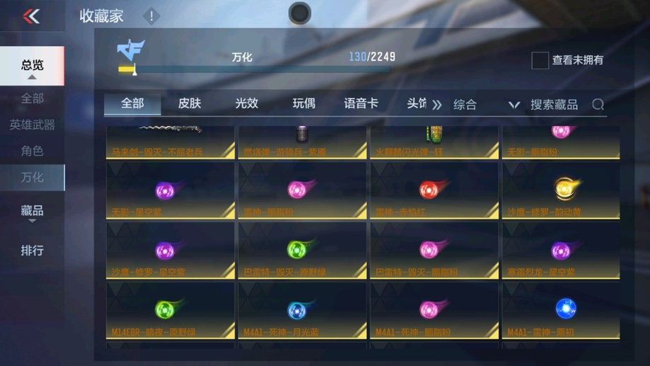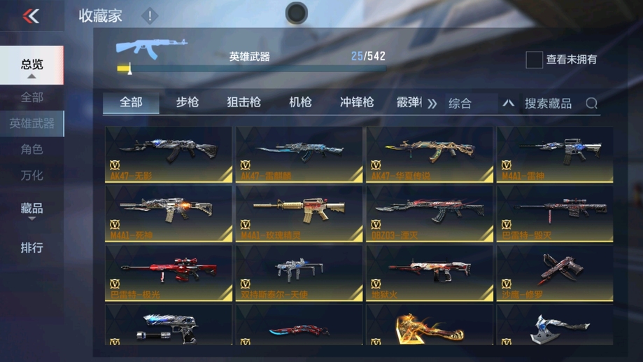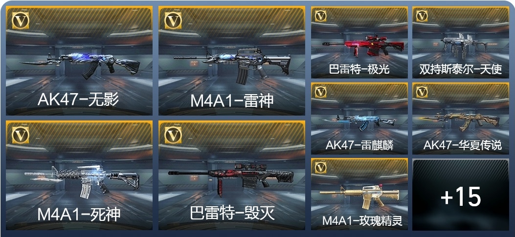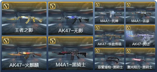 巴雷特-毀滅,M4A1-死神,巴雷特-極光,M4A1-雷神,AK47-無影,雙持斯泰爾-天使,M4A1-玫瑰精靈,AK47-雷麒麟,AK47-華夏傳說,QBZ03-湮滅,地獄火,沙鷹-修羅,沙鷹-無影,戰斧-無影,百戰巾幗槍,擎天覺醒,馬來劍-毀滅,蝴蝶刀-極光,血陽,龍嘯,黑武士閃光彈,黑武士手雷,黑武士煙霧彈,燃燒彈-遊騎兵