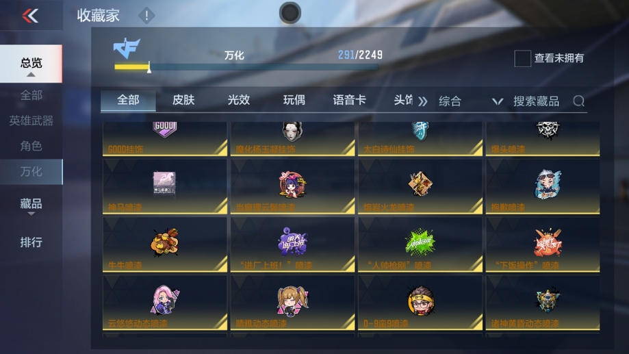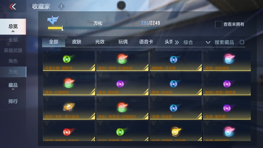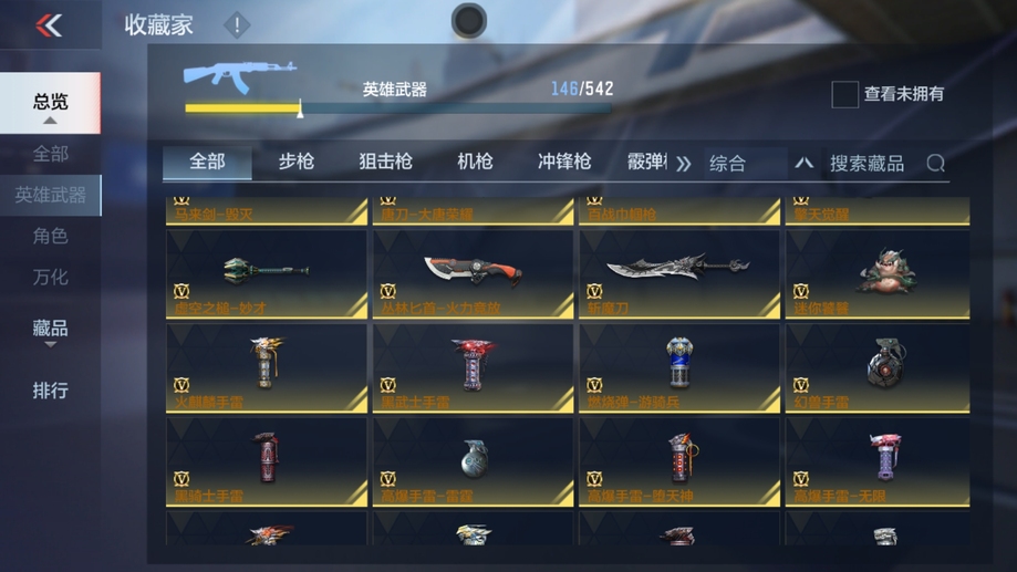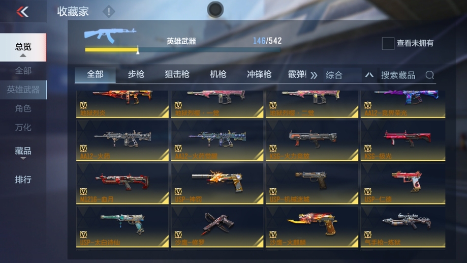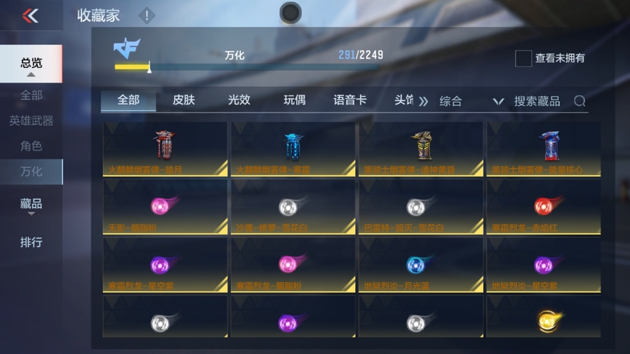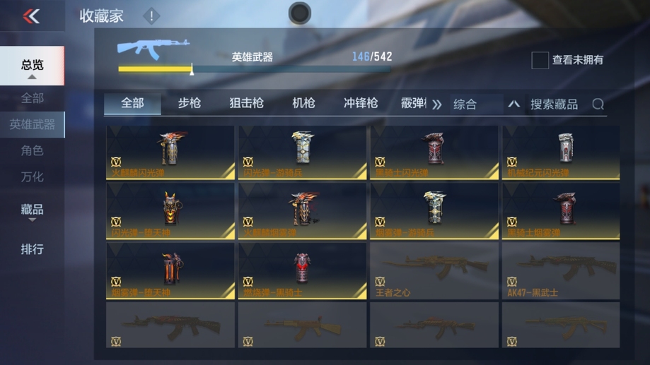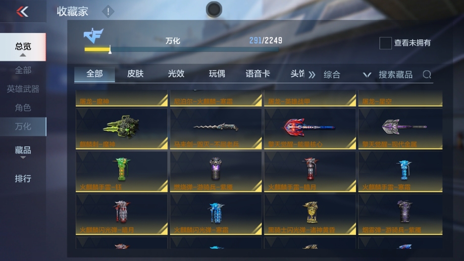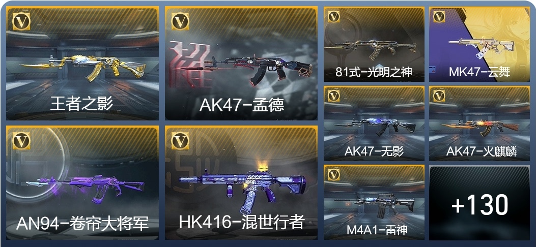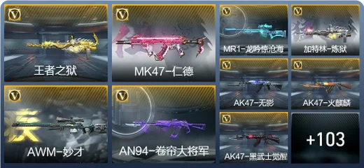 王者之影,AK47-孟德,AN94-捲簾大將軍,HK416-混世行者,81式-光明之神,M4A1-雷神,AK47-木蘭,M4A1-黑龍,M4A1-墮天神,M4A1-死神,M4A1-黑騎士,巴雷特-毀滅,巴雷特-極光,AK47-火麒麟,AK47-無影,QBZ03-金色薔薇,QBZ03-死神,AWM-天使,QBB95-極光,MK5-極光,雙持斯泰爾-天使,P90-雙脊龍,M12S-雷霆,M4A1-千變,M4A1-運輸船,M4A1-心動次元覺醒,M4A1-獵神,M4A1-夏清覺醒,M4A1-海騎士,M4A1-龍血,M4A1-賽博雷神,巴雷特-冬滅,AK47-心動次元,AK47-沙漠領主,AK47-春雅覺醒,AK47-幸運日,AK47-雷麒麟,AK47-血武士,AK47-沙漠郡主-超覺,AK47-麒麟,AN94-四凶覺醒,SCAR-幽暗騎士覺醒,SCAR-探星者,劍齒虎,SCAR-幽暗騎士,9A91-天神,M14EBR-天神,鐳射毀滅者Ⅲ,AWM-天龍,98K-星神,09式狙-魔音長歌覺醒,M200-心動次元覺醒,地獄烈櫻·二覺,M1216-血月,KSG-火力競放,KSG-極光,地獄烈炎,SCAR-印刷術覺醒,SCAR-印刷術,SCAR-守護者覺醒,M14EBR-拂影,QBZ03-玉面羞花,MK47-鼓龍,AK47-破空冰刃,湯姆遜-烈龍,劉易斯-星際方舟覺醒,加特林-堡壘,RPK-赤炎盤龍,PP19野牛-造紙術覺醒,嗜血金鯊,CZS2-血月,打擊者-天神,PP19野牛-造紙術,CZS2-心動次元覺醒,地獄火,氣手槍-煉獄,USP-仁德,9A91-魔蜥覺醒,柯爾特-仲達,MK23-瑜,蟒蛇-妙才,虎賁鉤鐮刀,墨刃-幻神,USP-機械迷城,沙鷹-火麒麟,沙鷹-修羅,改裝GLOCK-木蘭,QSZ92-金色薔薇,雙持柯爾特-極光,USP-太白詩仙,百戰巾幗槍,馬來劍-毀滅,擎天覺醒,手斧-機械迷城,龍嘯-墮天神,尼泊爾-雷霆,尼泊爾-機械紀元,USP-神罰,消音沙鷹-牛魔王,CZ75-窮奇,蟒蛇-火力競放,龍嘯,迷你饕餮,斬魔刀,唐刀-大唐榮耀,叢林匕首-火力競放,神罰戰斧,星芒,麒麟刺,太白詩仙扇,煙霧彈-墮天神,閃光彈-墮天神,高爆手雷-墮天神,高爆手雷-雷霆,黑騎士煙霧彈,黑騎士閃光彈,黑騎士手雷,黑武士手雷,幻獸手雷,火麒麟煙霧彈,火麒麟閃光彈,火麒麟手雷,閃光彈-遊騎兵,煙霧彈-遊騎兵,燃燒彈-遊騎兵,燃燒彈-黑騎士,高爆手雷-無限,地獄烈櫻·一覺,M4A1-太白詩仙,SCAR Light-白虎,MK47-雲舞,G3A3-五色琉璃覺醒,機械紀元閃光彈,QBZ191-金甲虎嘯覺醒,暗殺神,CBJ-MS-毒蜂,QCW05-變形金剛·大黃蜂,秋逸覺醒,龍鱗-覺醒
