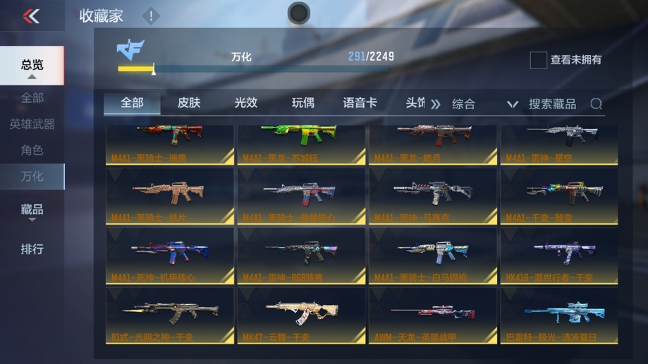 AK47-孟德,AN94-捲簾大將軍,HK416-混世行者,81式-光明之神,M4A1-雷神,AK47-木蘭,M4A1-黑龍,M4A1-墮天神,M4A1-死神,M4A1-黑騎士,巴雷特-毀滅,巴雷特-極光,AK47-火麒麟,AK47-無影,QBZ03-金色薔薇,QBZ03-死神,AWM-天使,MK5-極光,雙持斯泰爾-天使,P90-雙脊龍,M12S-雷霆,M4A1-千變,M4A1-運輸船,M4A1-心動次元覺醒,M4A1-獵神,M4A1-夏清覺醒,M4A1-海騎士,M4A1-龍血,M4A1-賽博雷神,巴雷特-冬滅,AK47-心動次元,AK47-沙漠領主,AK47-春雅覺醒,AK47-幸運日,AK47-雷麒麟,AK47-血武士,AK47-沙漠郡主-超覺,AK47-麒麟,AN94-四凶覺醒,SCAR-幽暗騎士覺醒,SCAR-探星者,劍齒虎,SCAR-幽暗騎士,9A91-天神,M14EBR-天神,鐳射毀滅者Ⅲ,AWM-天龍,09式狙-魔音長歌覺醒,M200-心動次元覺醒,地獄烈櫻·二覺,KSG-火力競放,KSG-極光,地獄烈炎,SCAR-印刷術覺醒,SCAR-印刷術,SCAR-守護者覺醒,M14EBR-拂影,QBZ03-玉面羞花,MK47-鼓龍,AK47-破空冰刃,湯姆遜-烈龍,劉易斯-星際方舟覺醒,加特林-堡壘,RPK-赤炎盤龍,PP19野牛-造紙術覺醒,嗜血金鯊,CZS2-血月,打擊者-天神,PP19野牛-造紙術,CZS2-心動次元覺醒,地獄火,氣手槍-煉獄,USP-仁德,9A91-魔蜥覺醒,柯爾特-仲達,MK23-瑜,蟒蛇-妙才,虎賁鉤鐮刀,墨刃-幻神,USP-機械迷城,沙鷹-火麒麟,沙鷹-修羅,改裝GLOCK-木蘭,QSZ92-金色薔薇,雙持柯爾特-極光,USP-太白詩仙,百戰巾幗槍,馬來劍-毀滅,擎天覺醒,手斧-機械迷城,龍嘯-墮天神,尼泊爾-雷霆,尼泊爾-機械紀元,USP-神罰,消音沙鷹-牛魔王,CZ75-窮奇,蟒蛇-火力競放,龍嘯,迷你饕餮,斬魔刀,唐刀-大唐榮耀,叢林匕首-火力競放,神罰戰斧,星芒,麒麟刺,太白詩仙扇,煙霧彈-墮天神,閃光彈-墮天神,高爆手雷-墮天神,高爆手雷-雷霆,黑騎士煙霧彈,黑騎士閃光彈,黑騎士手雷,黑武士手雷,幻獸手雷,火麒麟煙霧彈,火麒麟閃光彈,火麒麟手雷,閃光彈-遊騎兵,煙霧彈-遊騎兵,燃燒彈-遊騎兵,地獄烈櫻·一覺,M4A1-太白詩仙,SCAR Light-白虎,MK47-雲舞,G3A3-五色琉璃覺醒,機械紀元閃光彈,QBZ191-金甲虎嘯覺醒,暗殺神,龍鱗-覺醒