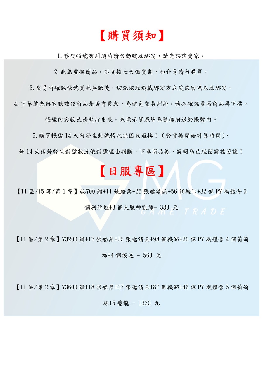 1.移交帳號有問題時請勿動號及綁定,請先諮詢賣家。 2.此為虚擬商品,不支持七天鑑賞期,如介意請勿購買。 3.交易時確認帳號資源無誤後,切記依照遊戲綁定方式更改密碼以及綁定。 4.下單前先與客服確認商品是否有更動,為避免交易糾紛,務必確認賣場商品再下標。 帳號內容物已清楚打出來,未標示資源皆為隨機附送於帳號內。 5.購買帳號14天內發生封號情況保固包退換!(發貨後開始計算時間), 若14天後若發生封號狀況依封號理由判斷,下單商品後,說明您已經閱讀該協議!