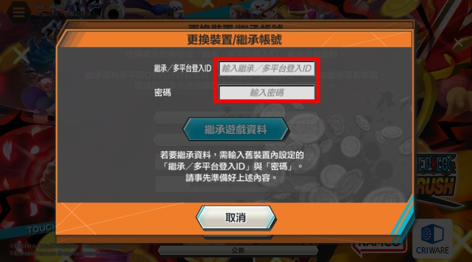 注意:引繼碼只能使用一次,引繼成功後無法刪除遊戲。繼承前必須關閉該遊戲的應用程式。換手機的話,得在引繼成功後的24小時後重新產生新的引繼碼。帳號為低等級帳號。