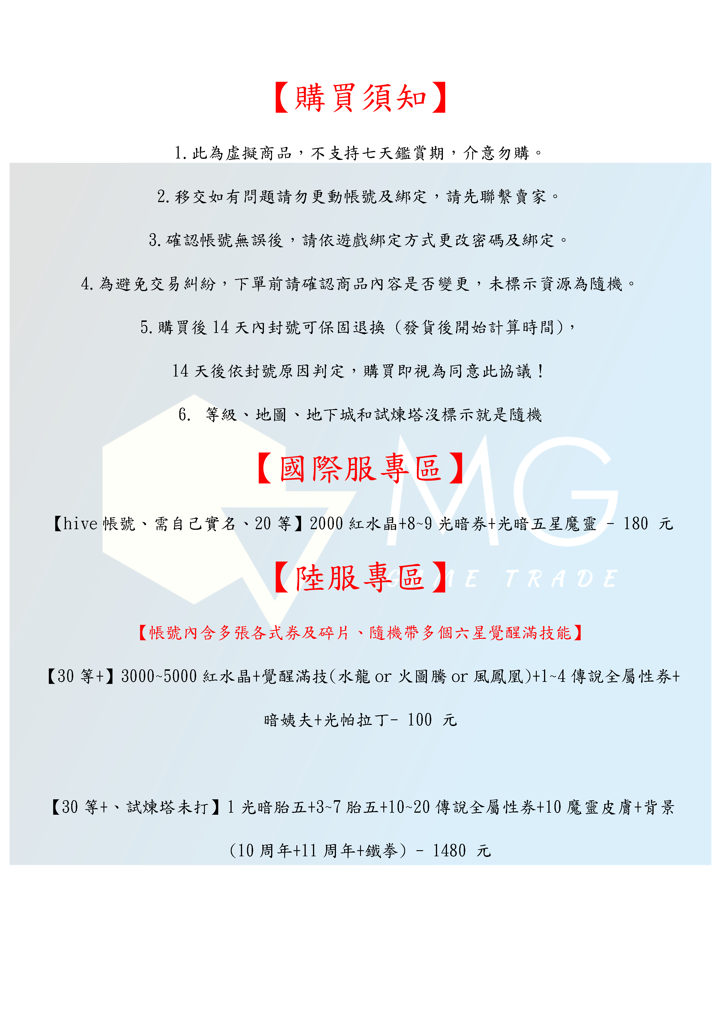 帳號 【初始號】 【MG數碼】 國際服 陸服 多石號 多鑽石號 初始號 自抽號 自選號