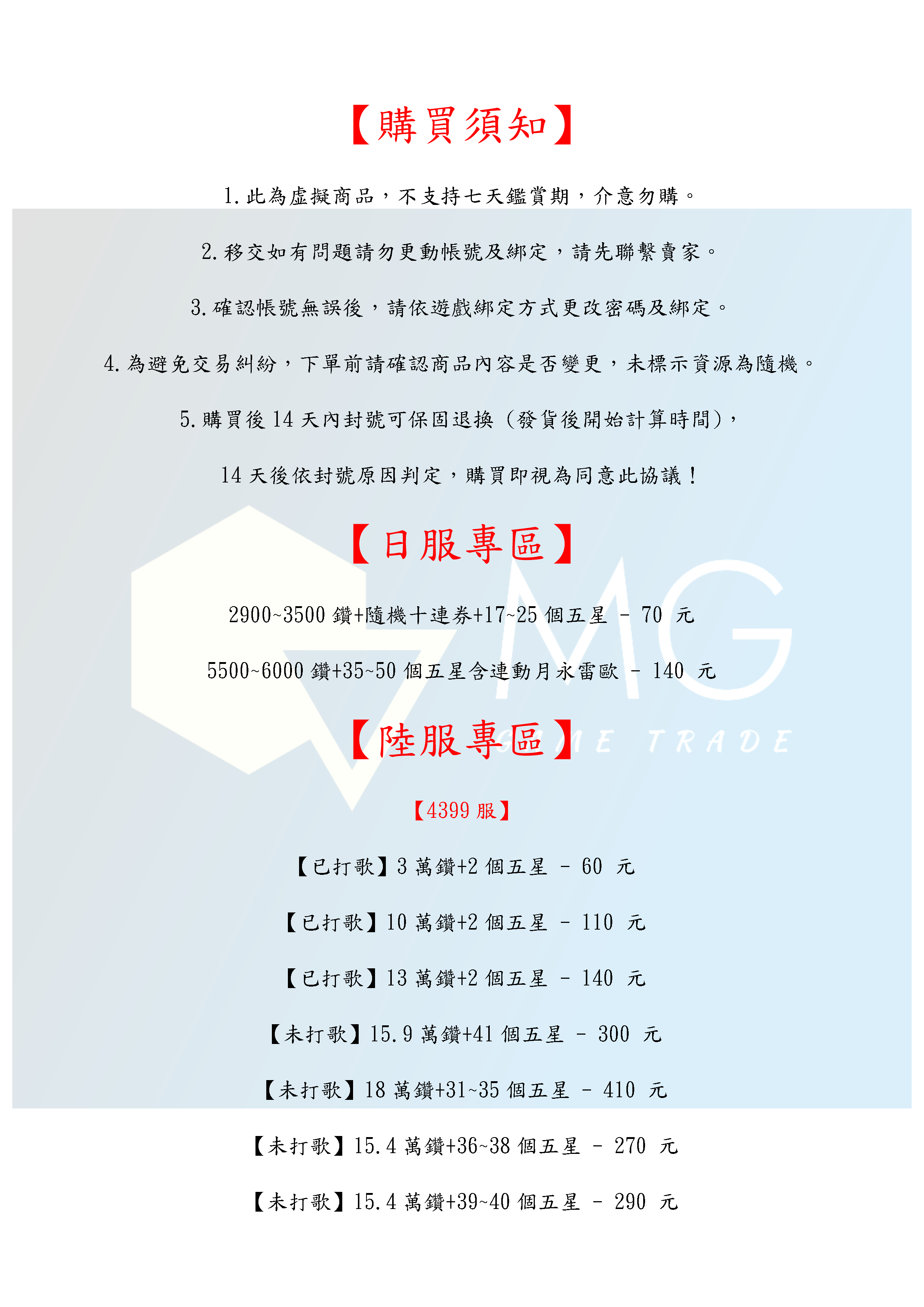 帳號 【初始號】 【MG數碼】 日服 陸服 多石號 多鑽石號 初始號 自抽號 自選號 自選組合