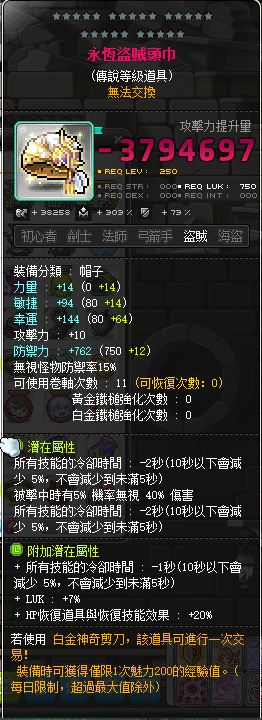 道具 【永恆盜賊頭巾】 -4CD/附加傳說-1CD 7%幸運 (便宜出售,可私訊詳談)