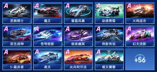 飛躍,暗夜伯爵,月光女神,凌霜風暴,駭客,魔王,極光,騎士精神,極音戰歌,雷霆風暴,幻影戰神,動感熊貓,風暴剃刀,超能橘喵,狂獅,柯星出擊,極夜幽冥,俠影傳說,尖兵阿爾法,雷諾,凌天,霹靂戰驅,天馬幻想,紫焰鎧甲,蔚藍迷夢,赤焰天啟,真我戰神GT,神影,卡羅拉 銳放,星河戰刃,筋斗雲,穹音星鯨,黃河守衛,幻夜霓虹,閃耀之星,大福蘆,瑪莎拉蒂MC20,霹靂針尖,墨染青花,AE86,風達 FC3S,怪獸,金剛狼,白鴿,橘神風暴,寒凌,攝魂,小橘喵,紫電,熾願,1週年剃刀,都市戰警,深海狂鯊,地獄霸天虎,流金NOBLE,國潮限定·大黃蜂,2週年燃魂,極鼠先鋒,黔靈,鱷霸,赤火流星,代號:律,蘭博基尼傳奇,金剛鎧影,甜心凱蒂,川麻高手,狸夢幻想,浪味仙蹤,布偶虎,藍翔挖掘機,春戀花車,萌菜出擊,航天逐夢,五菱鏡光,美猴王,遊遊福鯉,星創·鴻,迅龍,暴龍獸之力,炎龍烈焰,五菱橘光,凱美瑞,幻光魅影,1週年雄獅,極速衝鋒,櫻之翼,Speedy·橘,水槍騎兵,國潮限定·赤速,2週年鋒芒,童趣單車,弒鋒,天馬流星,鱷寶,天府茶影,蜜戀之風,風行瓷影,南瓜車,愛神之吻,愛神之心,1週年紀念,萌嘟福星