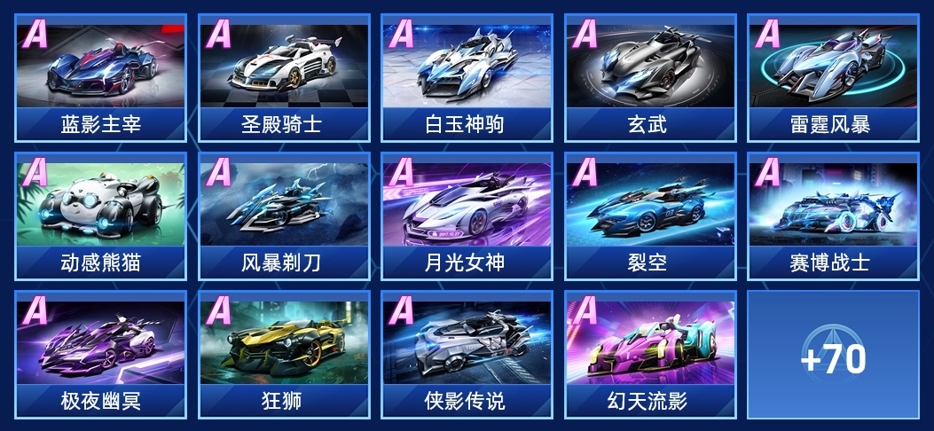 音速戰神,金剛狼,大Q吧,南瓜車,愛神之吻,月光女神,愛神之心,藍影主宰,聖殿騎士,白玉神駒,銀蛇,玄武,熾願,雷霆風暴,動感熊貓,風暴剃刀,白馬王子,裂空,地獄霸天虎,狂獅,賽博戰士,極夜幽冥,俠影傳說,鱷霸,3週年光輝,雷諾,幻天流影,凌天,S-天行者,蘭博基尼傳奇,蔚藍迷夢,繽紛神駒,逐夢號,赤焰天啟,川麻高手,真我戰神GT,天府茶影,狸夢幻想,築夢狸想,冥霄,阿斯拉達AKF-0,浪味仙蹤,神影,布偶虎,伊修扎克-蘭德爾,藍翔挖掘機,白桃戀人,春戀花車,破曉晨星,萌菜出擊,卡羅拉 銳放,星河戰刃,消除聯萌,五菱鏡光,筋斗雲,蜜戀之風,晶鑽星爵,穹音星鯨,美猴王,小鵬P7·雲岫,盛夏甜心,盛夏冰甜,黃河守衛,幻夜霓虹,馭龍雷諾,遊遊福鯉,星創·鴻,迅龍,全新十速,神聖天使獸,奶油巴達獸,暴龍獸之力,傳奇之翼-2022,閃耀之星,玉兔雷諾,童謠序曲,學霸,五菱橘光,炎龍駒,幻海之王,迷海之翼,驚蟄,瑪莎拉蒂MC20,墨染青花