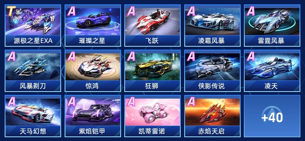 飛躍,大Q吧,璀璨之星,凌霜風暴,驚鴻,1週年剃刀,雷霆風暴,風暴剃刀,白馬王子,狂獅,俠影傳說,3週年光輝,雷諾,凌天,霹靂戰驅,天馬幻想,凱蒂雷諾,紫焰鎧甲,源極之星EXA,蔚藍迷夢,繽紛神駒,逐夢號,甜心凱蒂,赤焰天啟,S-冰魄,狸夢幻想,築夢狸想,阿斯拉達AKF-0,神影,伊修扎克-蘭德爾,赤韻流音,白桃戀人,春戀花車,破曉晨星,萌菜出擊,卡羅拉 銳放,星河戰刃,航天逐夢,消除聯萌,五菱鏡光,筋斗雲,蜜戀之風,瀚宇騎士,晶鑽星爵,穹音星鯨,美猴王,小鵬P7·雲岫,盛夏冰甜,遊遊福鯉,星創·鴻,迅龍,閃耀之星,五菱橘光,AE86