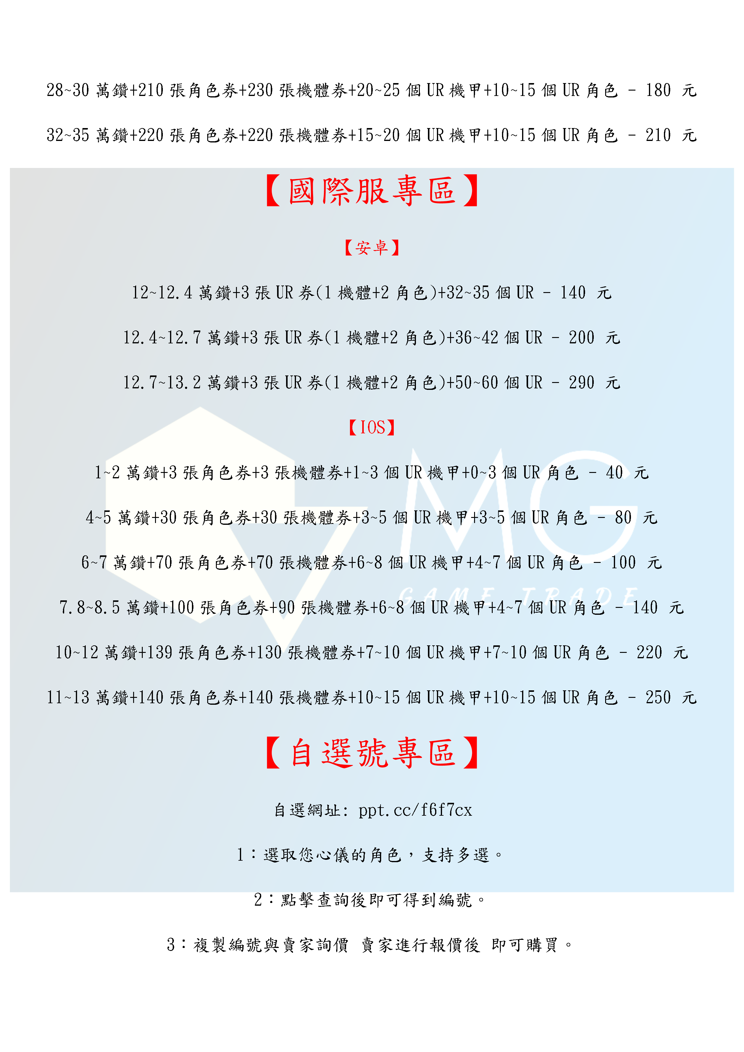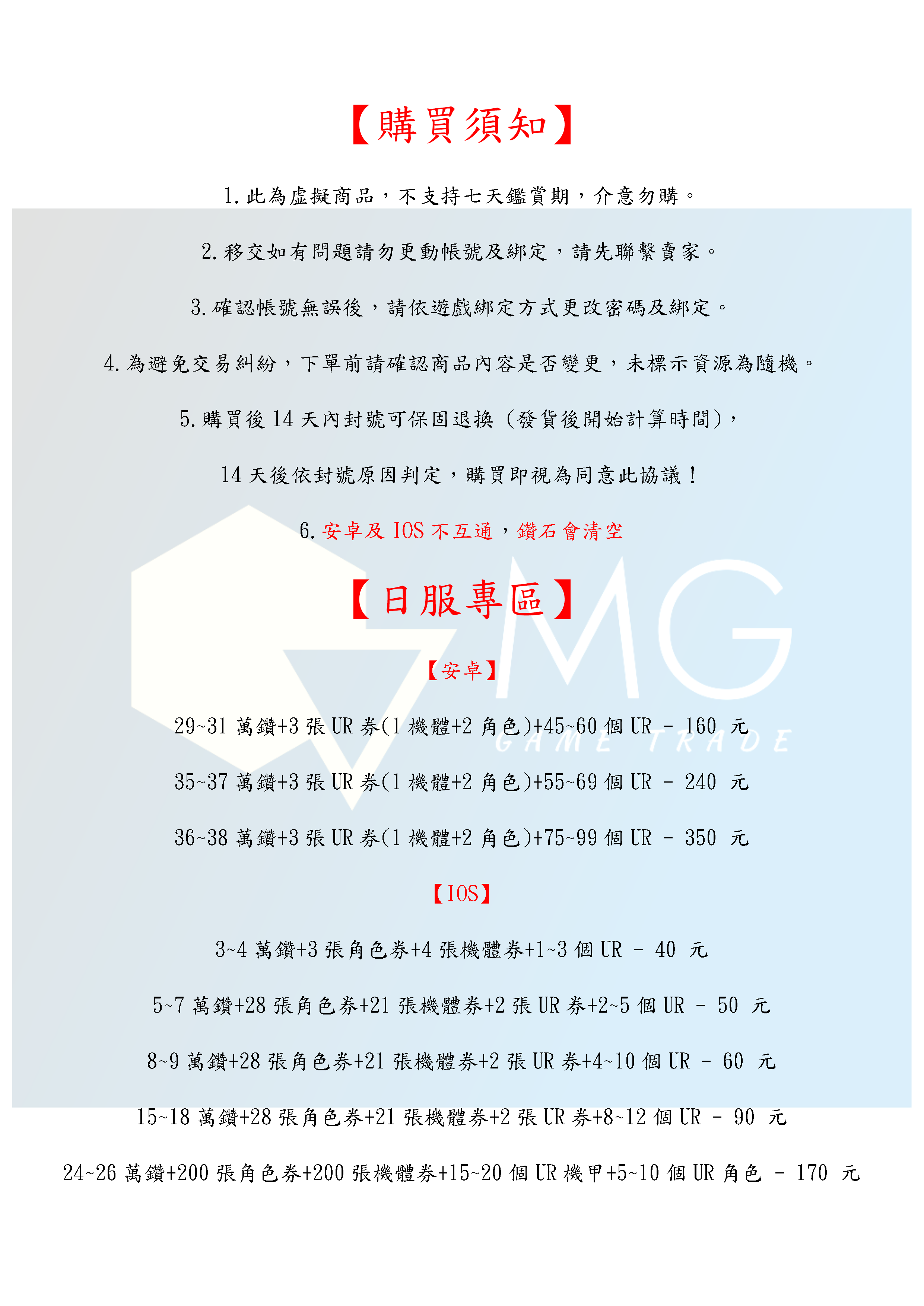 帳號 【初始號】 【MG數碼】 日服 國際服 多石號 多鑽石號 初始號 自抽號 自選號 自選組合