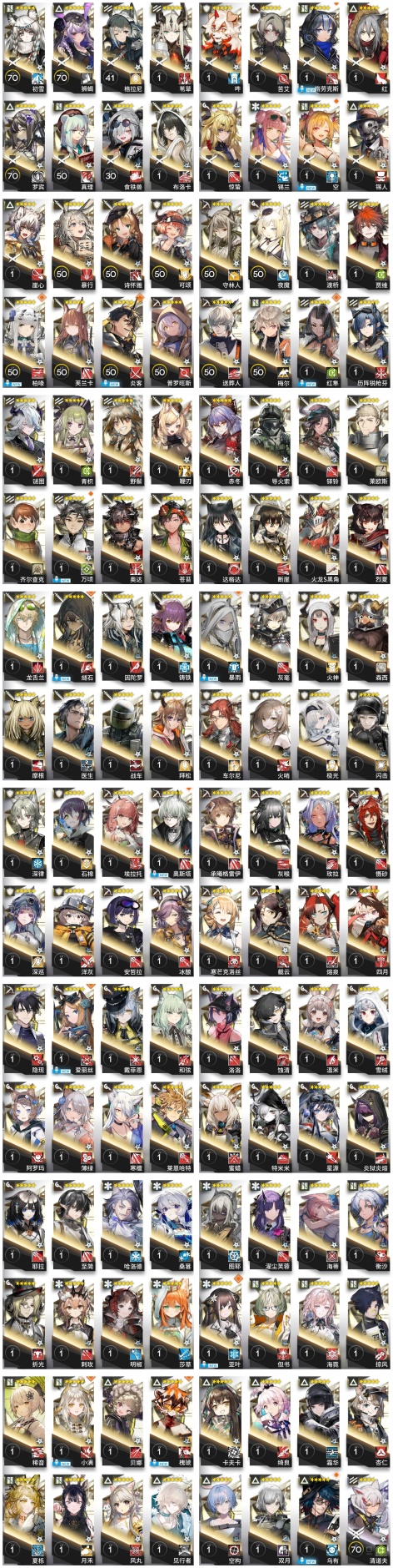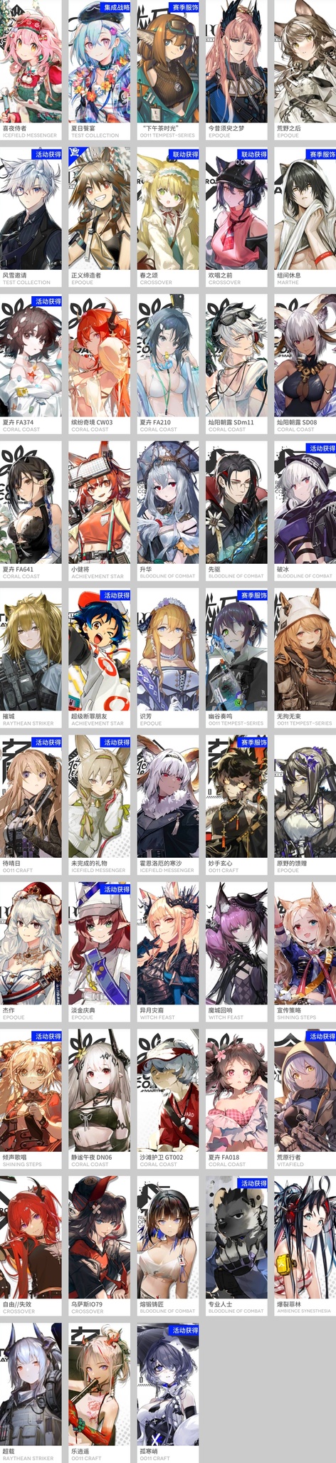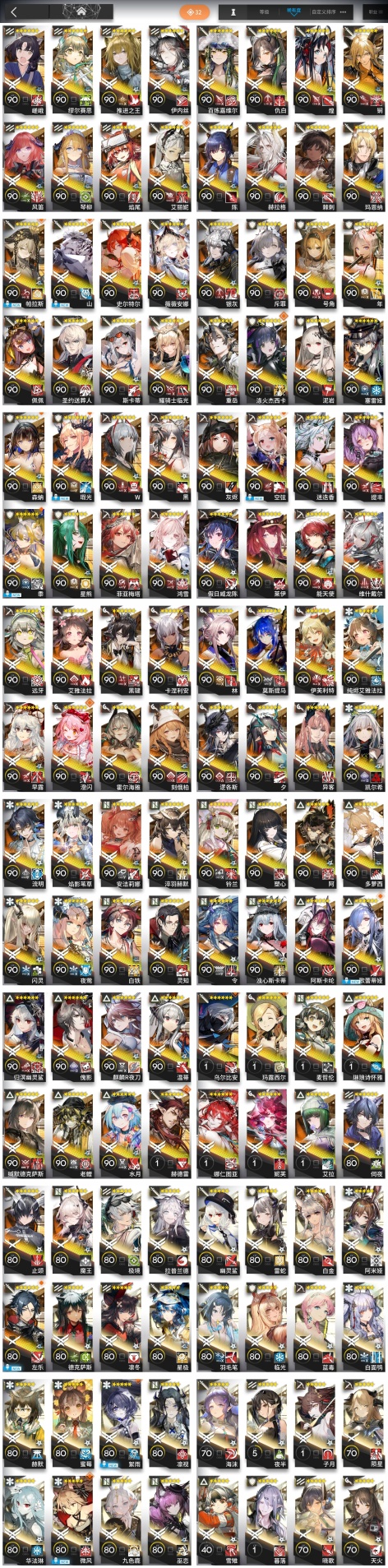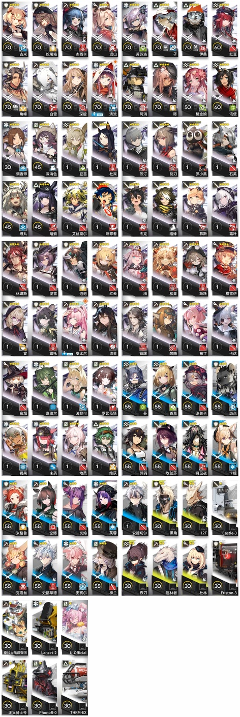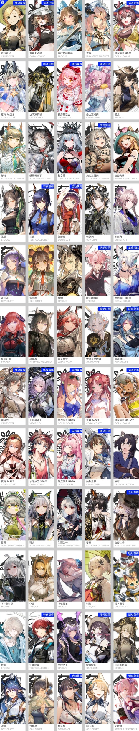 焰尾,邏各斯,森蚺,霍爾海雅,焰影葦草,史爾特爾,安潔莉娜,鐧,阿斯卡綸,塞雷婭,重嶽,夜鶯,夕,歸溟幽靈鯊,林,鴻雪,凱爾希,塑心,瑕光,仇白,伊芙利特,靈知,風笛,鈴蘭,妮芙,薇薇安娜,琳琅詩懷雅,赫拉格,銀灰,假日威龍陳,伺夜,迷迭香,號角,琴柳,淬羽赫默,帕拉斯,斯卡蒂,刻俄柏,緘默德克薩斯,阿,多蘿西,麥哲倫,維什戴爾,星熊,陳,卡涅利安,煌,艾雅法拉,黑,嵯峨,老鯉,耀騎士臨光,W,水月,閃靈,能天使,推進之王,流明,純燼艾雅法拉,空弦,莫斯提馬,令,早露,聖約送葬人,澄閃,萊伊,斥罪,泥岩,白鐵,異客,提豐,遠牙,止頌,黑鍵,棘刺,伊內絲,山,灰燼,濁心斯卡蒂,溫蒂,年,繆爾賽思,菲亞梅塔,傀影,麒麟R夜刀,瑪恩納,艾麗妮,百鍊嘉維爾