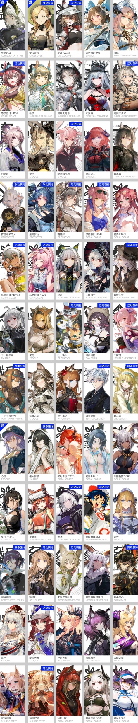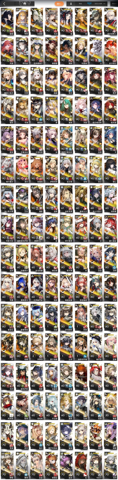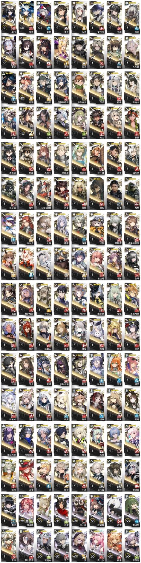 焰尾,森蚺,霍爾海雅,焰影葦草,史爾特爾,安潔莉娜,鐧,塞雷婭,夜鶯,夕,歸溟幽靈鯊,林,鴻雪,凱爾希,塑心,瑕光,仇白,伊芙利特,靈知,風笛,鈴蘭,薇薇安娜,琳琅詩懷雅,赫拉格,銀灰,佩佩,假日威龍陳,伺夜,迷迭香,號角,琴柳,淬羽赫默,帕拉斯,斯卡蒂,刻俄柏,緘默德克薩斯,歌蕾蒂婭,阿,多蘿西,麥哲倫,星熊,陳,卡涅利安,煌,艾雅法拉,黑,嵯峨,老鯉,耀騎士臨光,W,水月,閃靈,能天使,推進之王,流明,純燼艾雅法拉,空弦,莫斯提馬,令,早露,聖約送葬人,澄閃,娜仁圖亞,萊伊,斥罪,泥岩,白鐵,異客,提豐,遠牙,止頌,棘刺,伊內絲,山,灰燼,濁心斯卡蒂,溫蒂,年,繆爾賽思,菲亞梅塔,傀影,麒麟R夜刀,瑪恩納,艾麗妮,百鍊嘉維爾