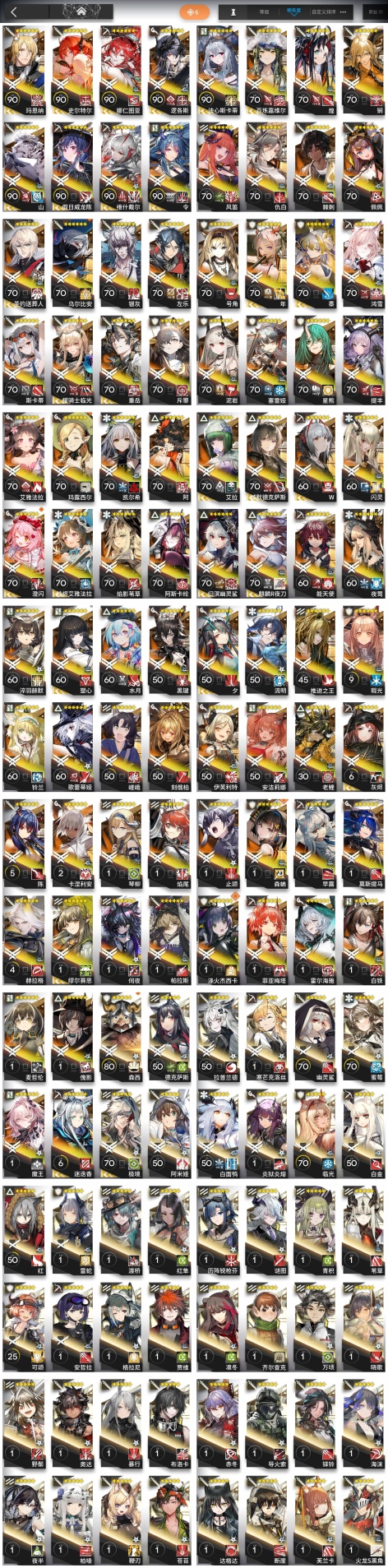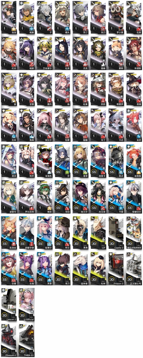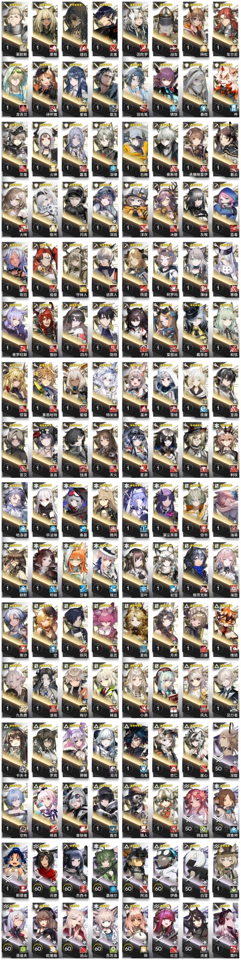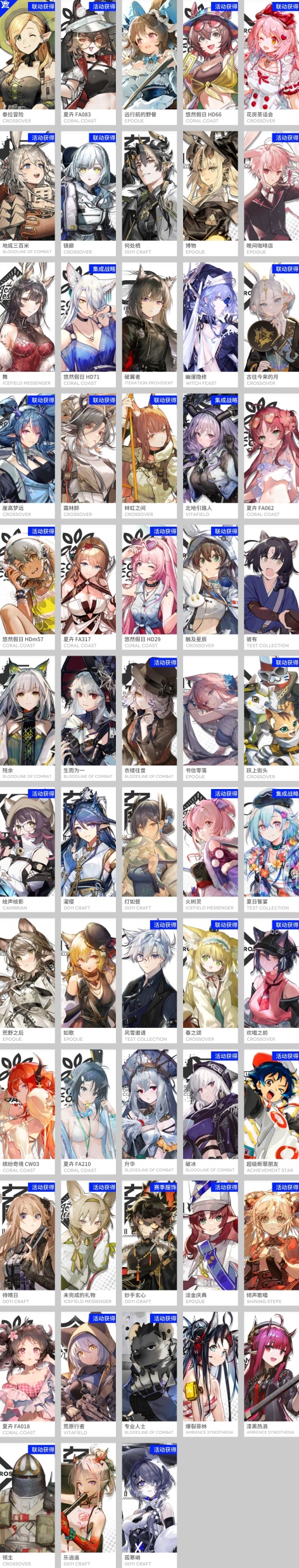 焰尾,森蚺,霍爾海雅,焰影葦草,史爾特爾,安潔莉娜,鐧,塞雷婭,重嶽,夜鶯,夕,歸溟幽靈鯊,鴻雪,凱爾希,塑心,瑕光,仇白,伊芙利特,風笛,鈴蘭,赫拉格,銀灰,佩佩,假日威龍陳,伺夜,迷迭香,號角,琴柳,淬羽赫默,帕拉斯,斯卡蒂,刻俄柏,緘默德克薩斯,歌蕾蒂婭,阿,麥哲倫,星熊,陳,卡涅利安,煌,艾雅法拉,嵯峨,老鯉,耀騎士臨光,W,水月,閃靈,能天使,推進之王,流明,純燼艾雅法拉,莫斯提馬,令,早露,聖約送葬人,澄閃,娜仁圖亞,斥罪,泥岩,白鐵,提豐,止頌,黑鍵,棘刺,山,灰燼,濁心斯卡蒂,年,繆爾賽思,菲亞梅塔,傀影,麒麟R夜刀,瑪恩納,百鍊嘉維爾