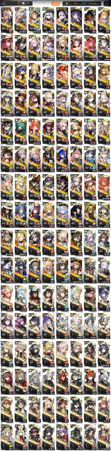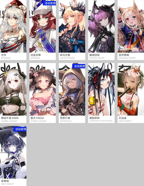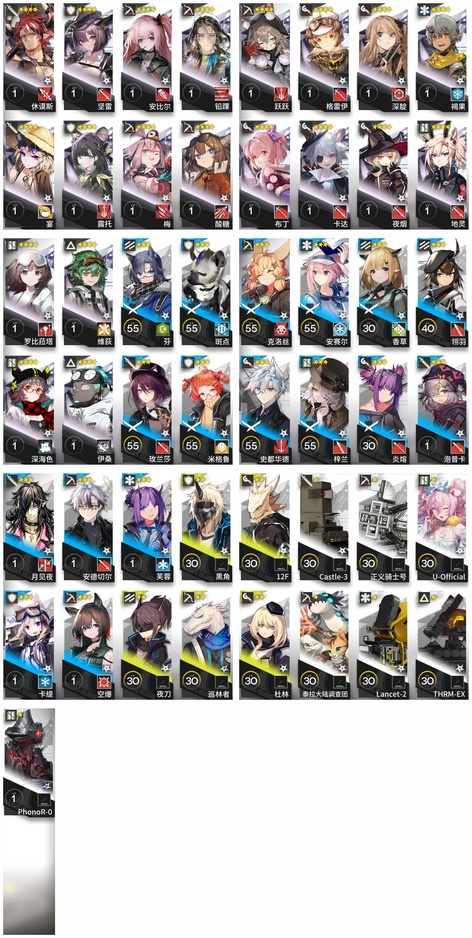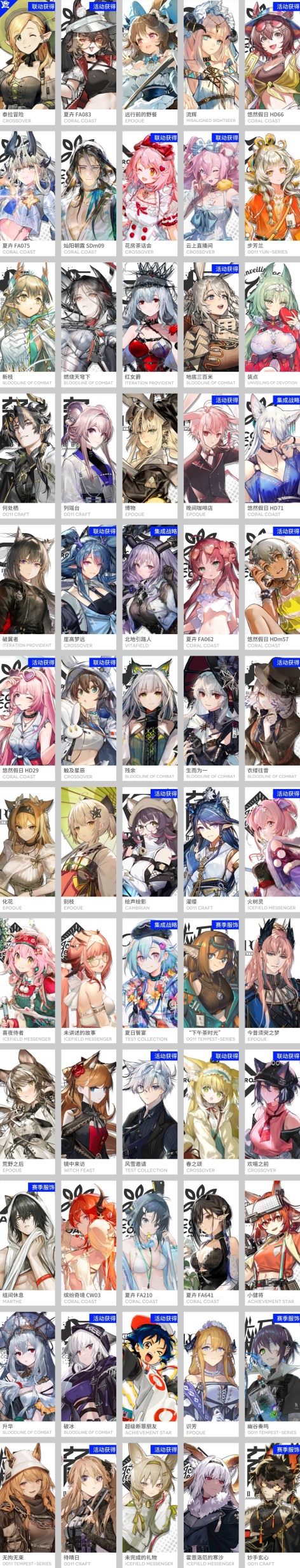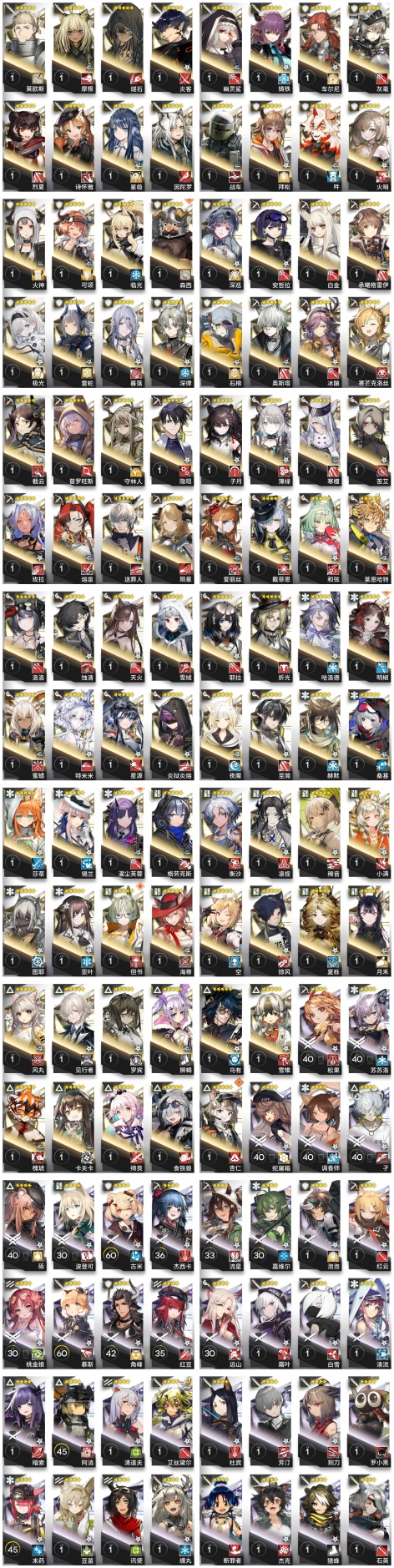 焰尾,森蚺,霍爾海雅,焰影葦草,史爾特爾,安潔莉娜,塞雷婭,重嶽,夜鶯,歸溟幽靈鯊,林,凱爾希,瑕光,仇白,伊芙利特,靈知,風笛,鈴蘭,薇薇安娜,琳琅詩懷雅,銀灰,佩佩,假日威龍陳,伺夜,號角,琴柳,淬羽赫默,帕拉斯,斯卡蒂,歌蕾蒂婭,阿,多蘿西,麥哲倫,星熊,陳,卡涅利安,艾雅法拉,嵯峨,老鯉,耀騎士臨光,W,水月,閃靈,能天使,推進之王,流明,純燼艾雅法拉,空弦,莫斯提馬,令,聖約送葬人,萊伊,斥罪,泥岩,異客,止頌,黑鍵,棘刺,伊內絲,山,濁心斯卡蒂,溫蒂,菲亞梅塔,傀影,麒麟R夜刀,瑪恩納,艾麗妮,百鍊嘉維爾