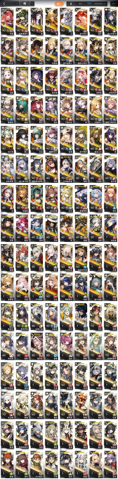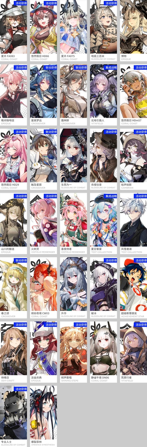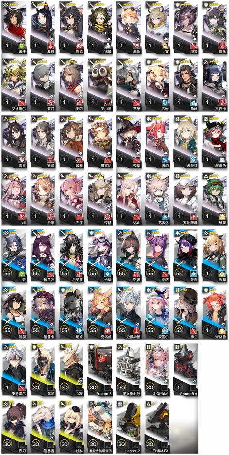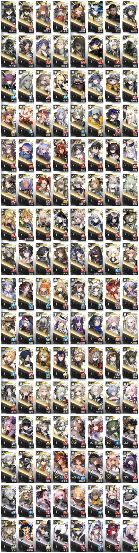 焰尾,霍爾海雅,焰影葦草,史爾特爾,安潔莉娜,鐧,塞雷婭,重嶽,夜鶯,夕,歸溟幽靈鯊,林,鴻雪,凱爾希,塑心,瑕光,仇白,伊芙利特,靈知,風笛,鈴蘭,琳琅詩懷雅,銀灰,佩佩,假日威龍陳,伺夜,迷迭香,號角,琴柳,淬羽赫默,斯卡蒂,刻俄柏,緘默德克薩斯,歌蕾蒂婭,阿,多蘿西,麥哲倫,星熊,陳,卡涅利安,煌,艾雅法拉,老鯉,耀騎士臨光,W,水月,閃靈,能天使,推進之王,流明,純燼艾雅法拉,空弦,莫斯提馬,早露,聖約送葬人,澄閃,萊伊,泥岩,異客,提豐,止頌,黑鍵,棘刺,伊內絲,山,灰燼,濁心斯卡蒂,溫蒂,繆爾賽思,麒麟R夜刀,瑪恩納,艾麗妮,百鍊嘉維爾