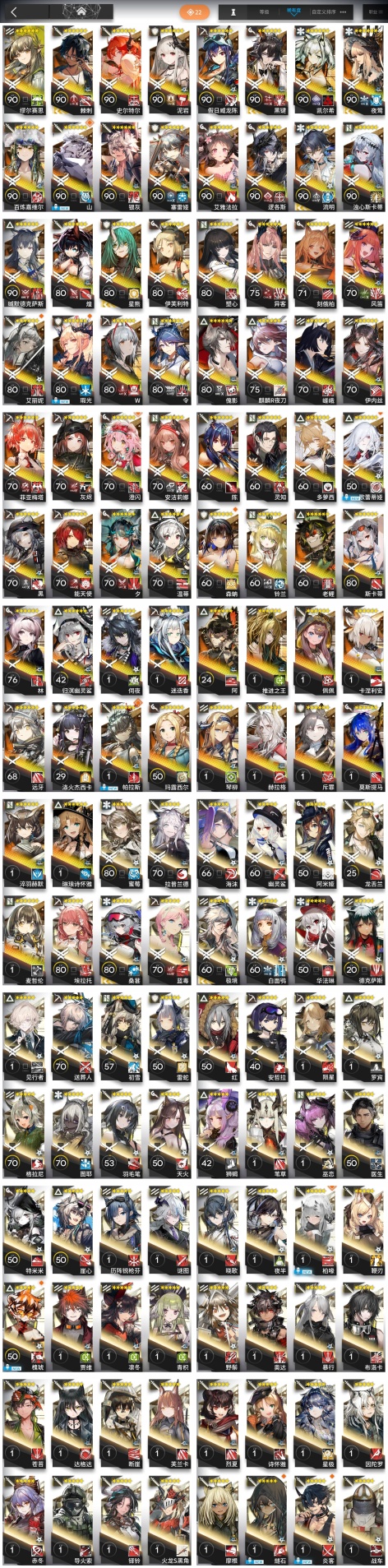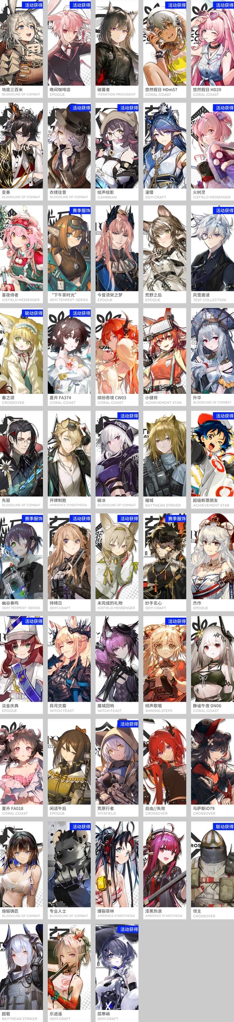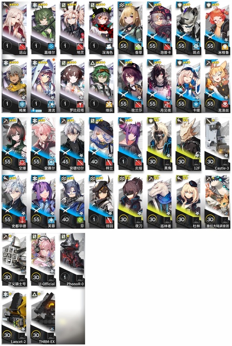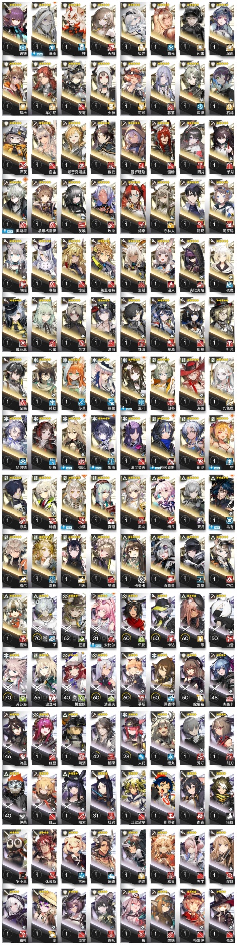 邏各斯,森蚺,史爾特爾,安潔莉娜,塞雷婭,夜鶯,夕,歸溟幽靈鯊,林,凱爾希,塑心,瑕光,伊芙利特,靈知,風笛,鈴蘭,琳琅詩懷雅,赫拉格,銀灰,假日威龍陳,伺夜,迷迭香,琴柳,淬羽赫默,帕拉斯,斯卡蒂,刻俄柏,緘默德克薩斯,阿,多蘿西,麥哲倫,星熊,陳,卡涅利安,煌,艾雅法拉,黑,嵯峨,老鯉,W,能天使,推進之王,流明,莫斯提馬,令,澄閃,斥罪,泥岩,異客,遠牙,黑鍵,棘刺,伊內絲,山,灰燼,濁心斯卡蒂,溫蒂,繆爾賽思,菲亞梅塔,傀影,麒麟R夜刀,艾麗妮,百鍊嘉維爾