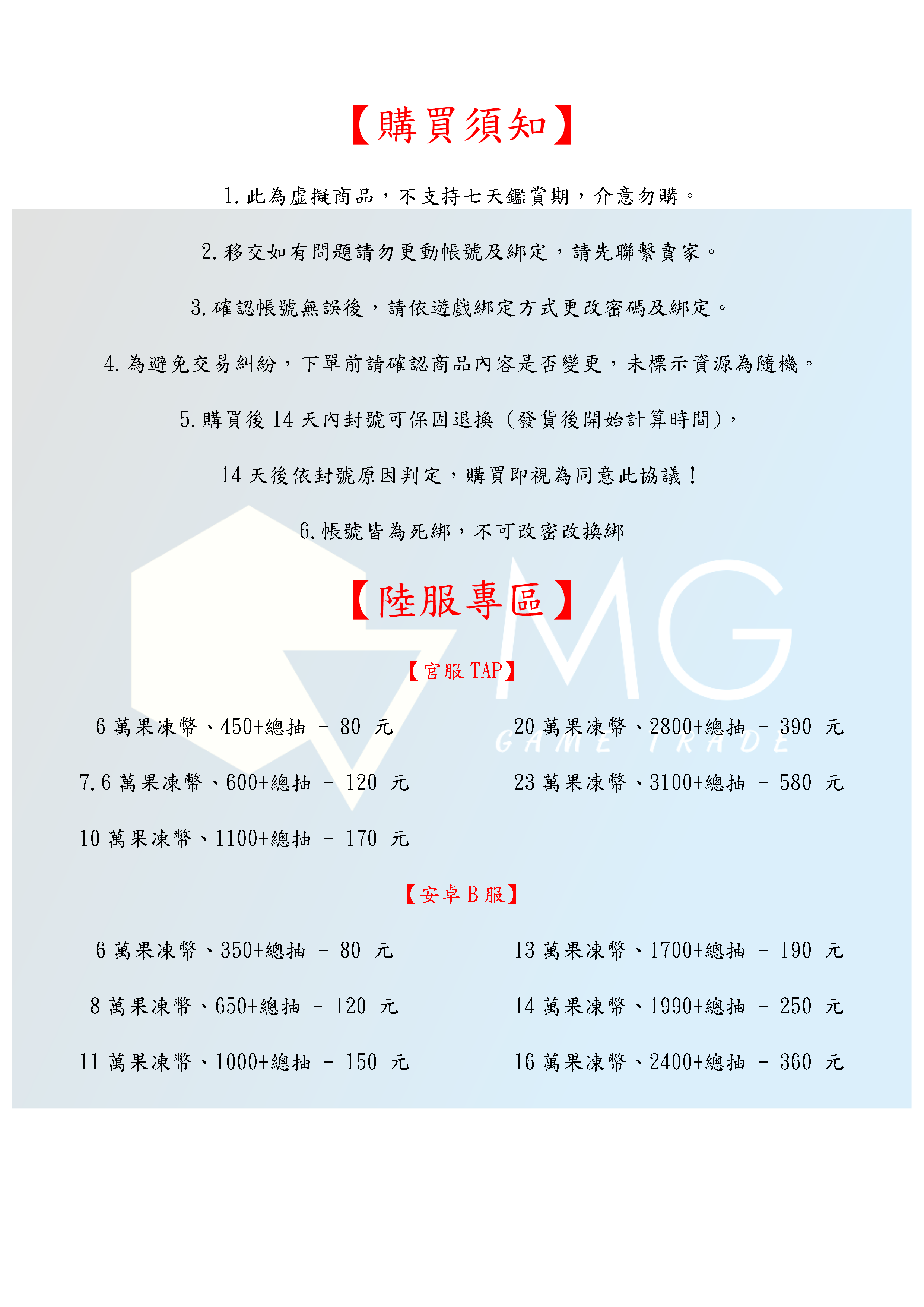 3.交易時確認帳號資源無誤後,切記依照遊戲綁定方式更改密碼以及綁定。