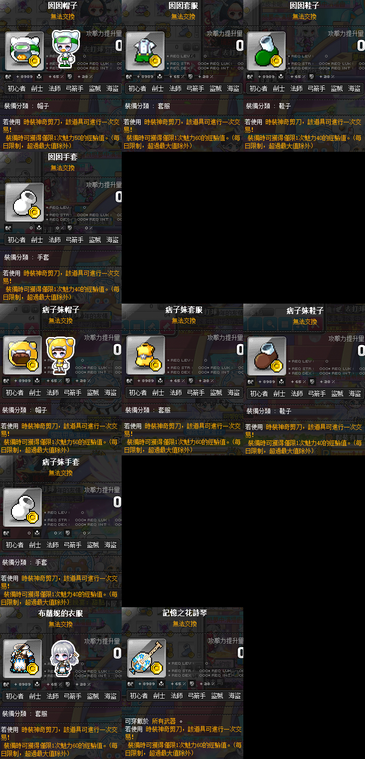 維多利亞盃套組 (帽子+套服+鞋子+披風+武器):5件 整套1400T含刀(劍士/法師/弓箭手/盜賊/海盜)