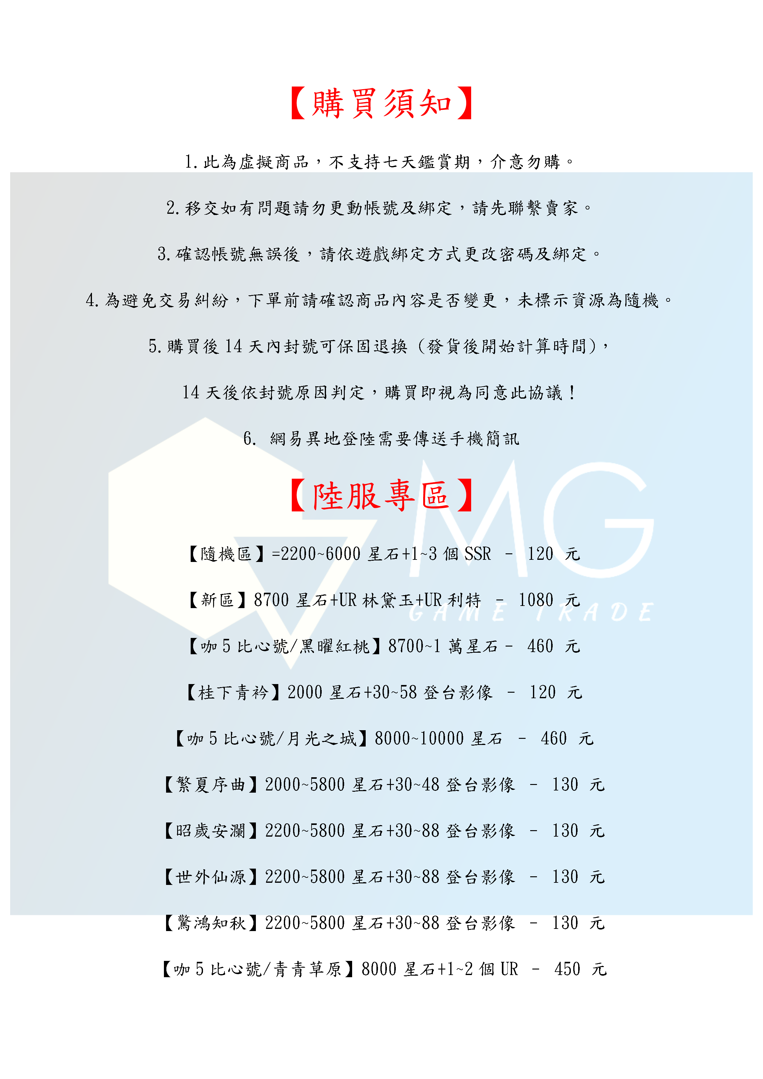帳號 【初始號】 【MG數碼】 陸服 多石號 多鑽石號 初始號 自抽號 自選號