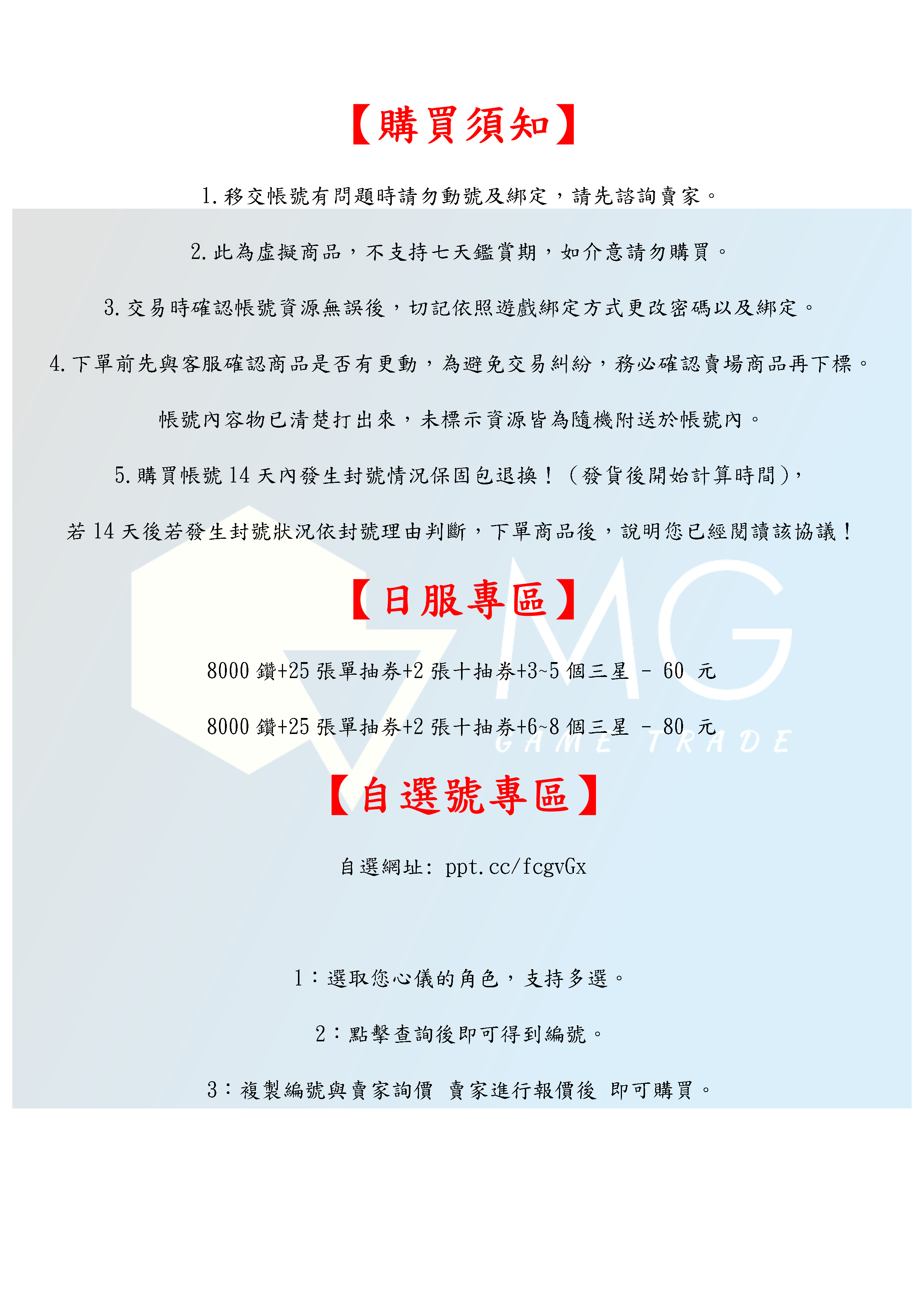 3.交易時確認帳號資源無誤後,切記依照遊戲綁定方式更改密碼以及綁定。