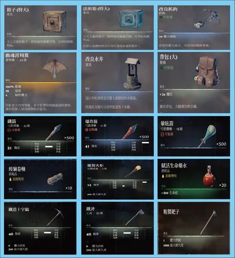 其他材料(氨腺/羽毛/毒袋/黑火藥/霧鎖之油/霧幕袋等等包含其他煉金素材)=各4組(各200個)/400t